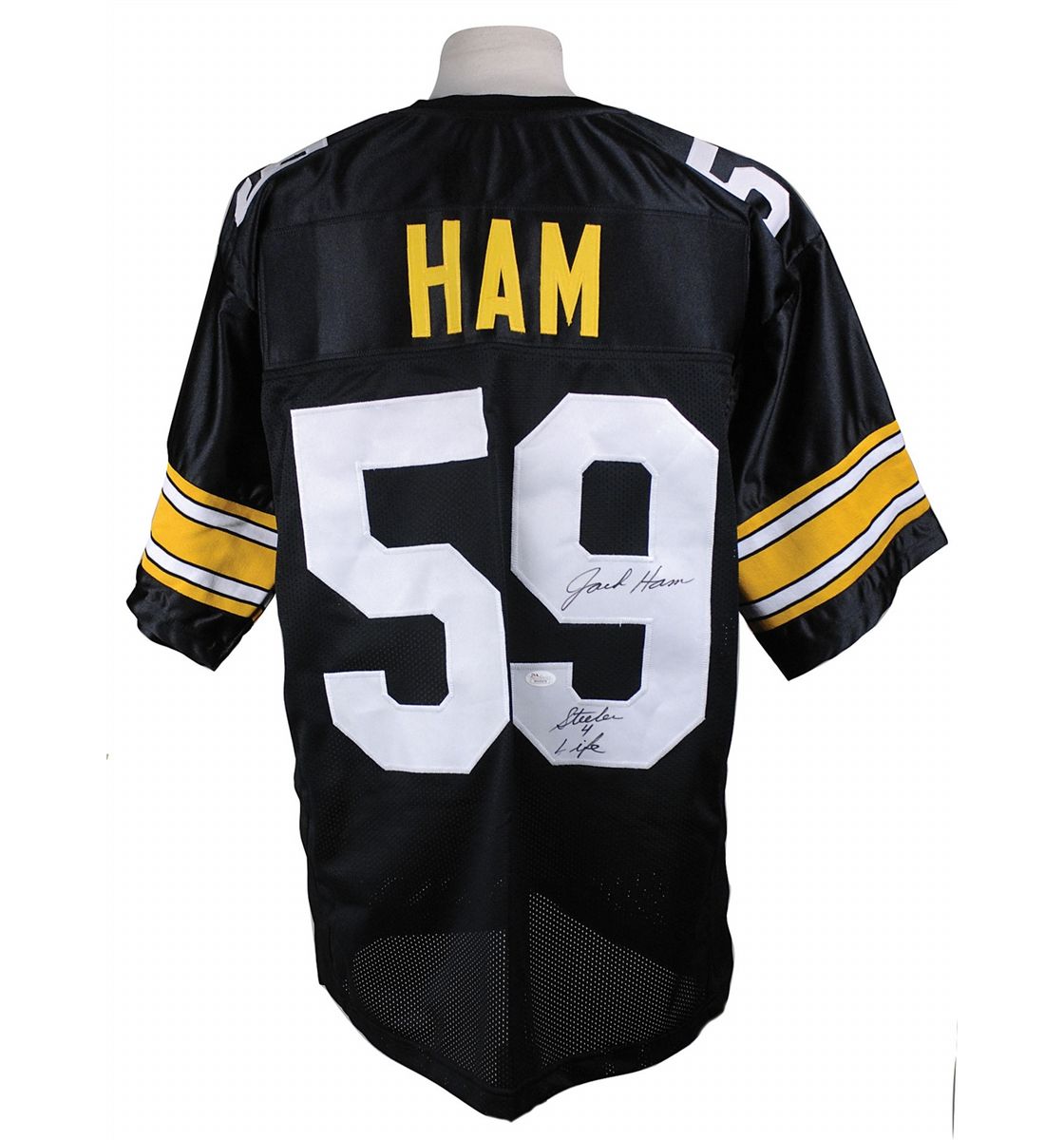 Replica Pittsburgh Steelers football jersey, with sewn on letters and numbers, signed in black felt tip on the number on the back, “Jack Ham, Steeler 4 Life.” In fine condition, with a JSA label affixed to the number. Accompanied by a certificate of authenticity from JSA.