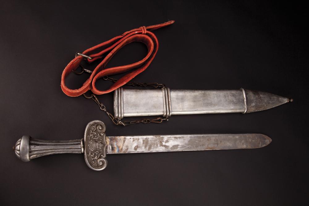(MGM, 1959) Roman centurian metal short sword, metal scabbard and suede leather belt used in the ship scene by Jack Hawkins in his role as “Quintus Arrius.” It features a decorative metal hilt and measures 25 in. long. The red suede belt exhibits minor wear and cracks but remains in remarkable condition.