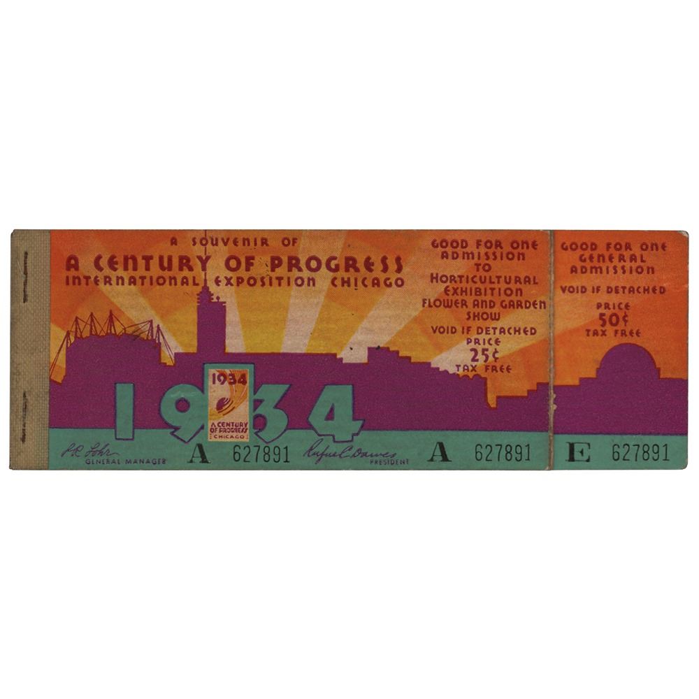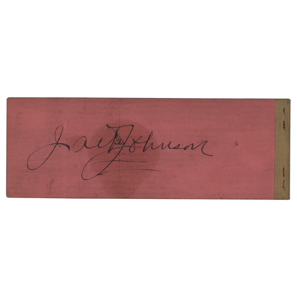 Rare ink signature, “Jack Johnson,” penned on the back of a 6.5 x 2.25 ticket booklet for the 1933-1934 Century of Progress International Exposition, which is more popularly known as the Chicago World's Fair. The booklet contains five admission tickets and ticket stubs for various displays and attractions, such as the 'Horticultural Exhibition,' 'Old England,' 'Tunisia,' and 'Fort Dearborn or Lama Temple or Colonial Village'; the latter, the only full-sized ticket, is signed on the reverse by Johnson. In very good to fine condition, with a circular stain touching the signature.