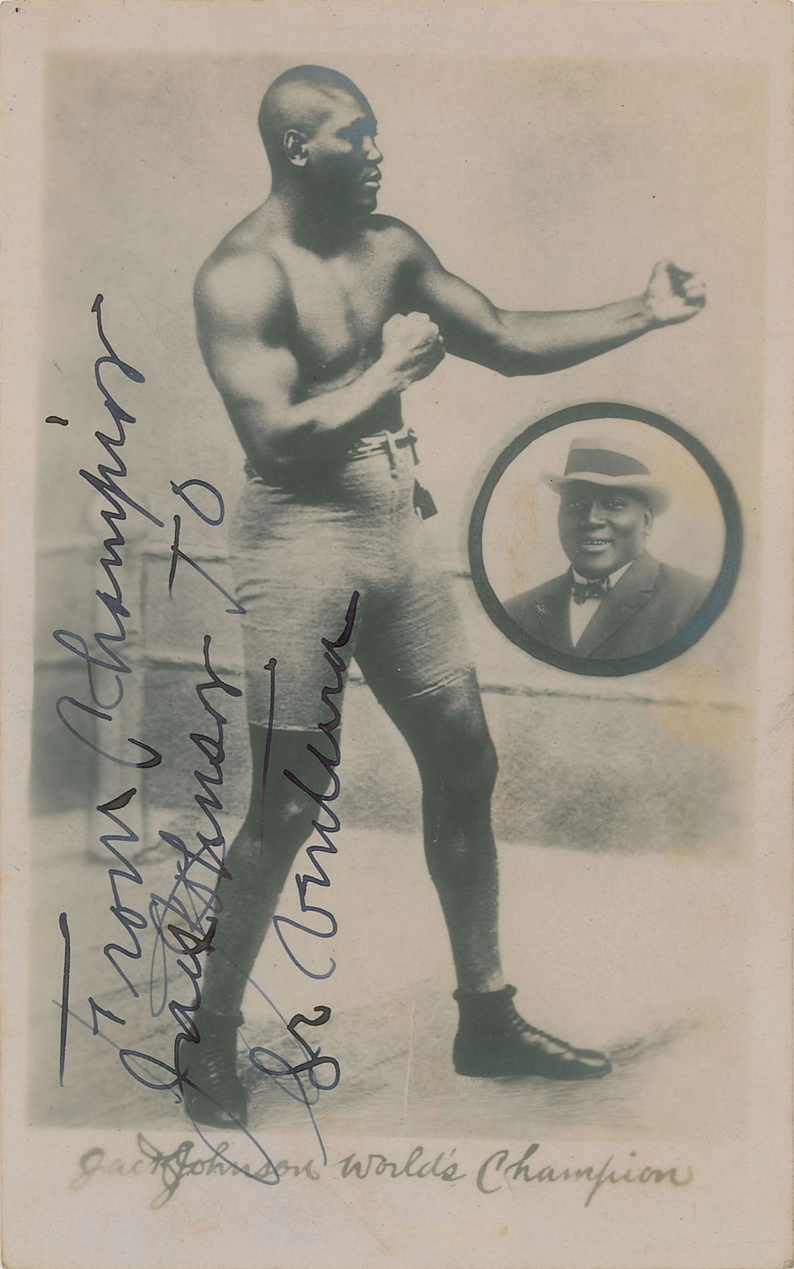 Superb vintage matte-finish 3.5 x 5.5 'Velvograph' postcard photo, signed and inscribed in fountain pen "From Champion Jack Johnson to Sr. Ventura.” The photo shows Johnson in a classic bare-knucklde boxing pose, with an inset image of him in formal attire. In fine to very fine condition, with old mounting remnants on the reverse. A magnificent autograph from the legendary boxing champ.