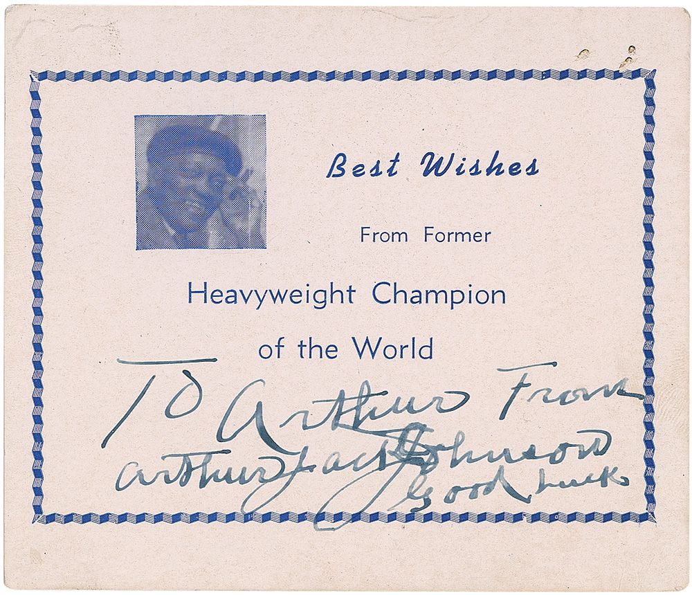 Colorful African-American boxer (1878–1946) who held the world heavyweight championship from 1908 to 1915 and whose achievements in and out of the ring created an unprecedented storm of racially charged controversy. Very rare full vintage fountain pen signature and inscription, “To Arthur from Arthur Jack Johnson, Good luck,” on an off-white 4.5 x 3.75 card, bearing a preprinted sentiment which reads, “Best wishes from Former Heavyweight Champion of the World,” and an image of Johnson. In fine condition, with a staple hole to top, a couple light bends, and a hint of trivial soiling. This example is the first full signature of Johnson we have seen.
