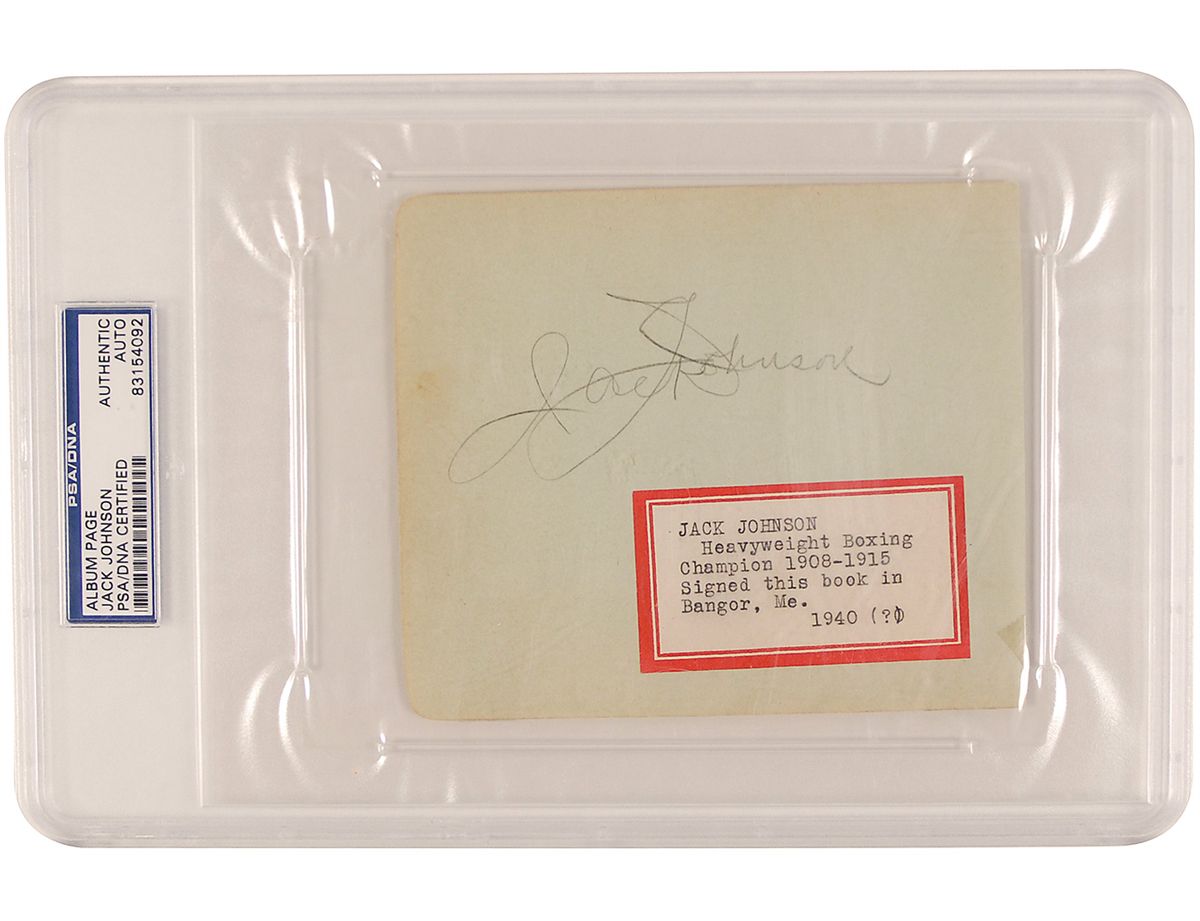 Vintage pencil signature, “Jack Johnson,” on a light green 5.25 x 4.5 album page with a collector’s caption affixed to lower right. Encapsulated in a plastic PSA/DNA authentication holder. In fine condition, with some light edge toning and a small tape remnant to lower right.