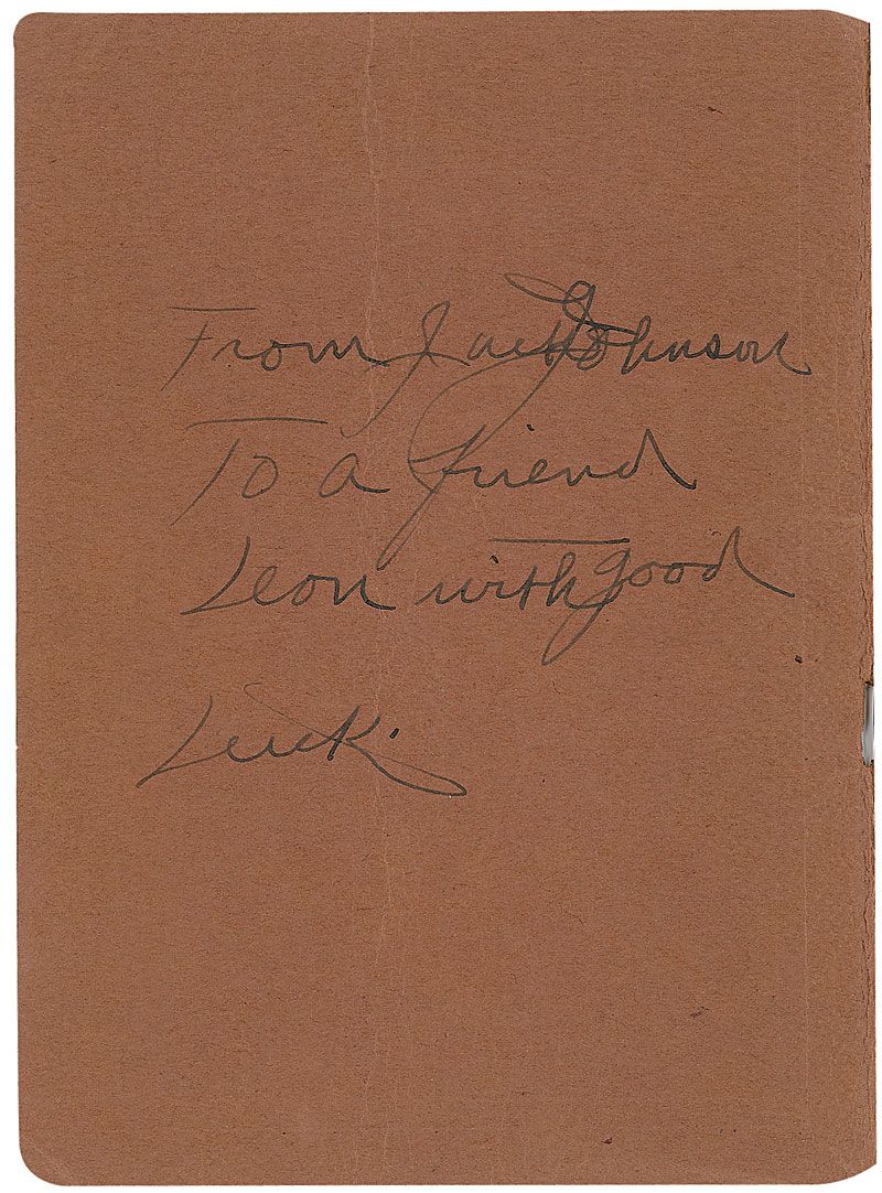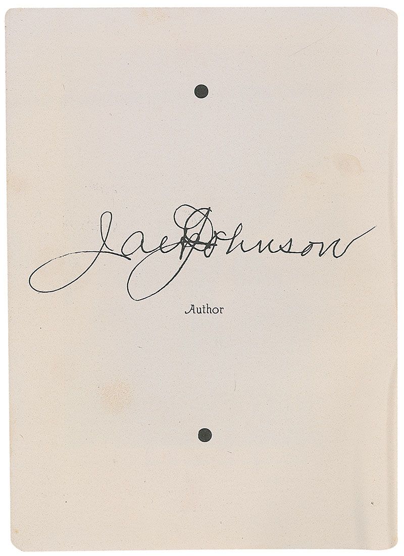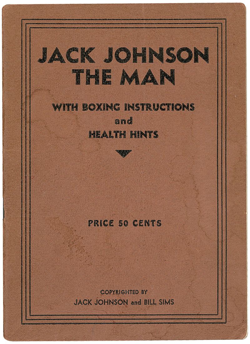 Rare softcover booklet entitled Jack Johnson: The Man, 5 x 6.75, 48 pages, circa late 1920s to early 1930s, signed and inscribed inside the front cover in fountain pen, “From Jack Johnson, to a friend Leon, with good luck.” In very good condition, with scattered dampstaining to front cover (not visible inside), and a central vertical crease to booklet (passing through the inscription and very start of the signature).