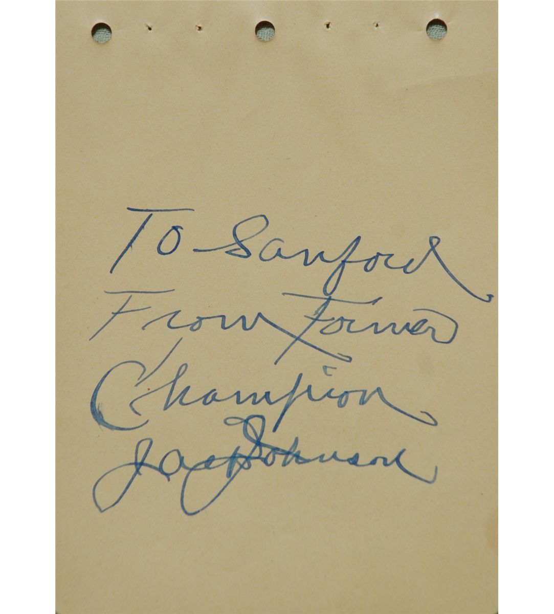 Colorful African-American boxer (1878–1946) who held the world heavyweight championship from 1908 to 1915 and whose achievements in and out of the ring created an unprecedented storm of racially charged controversy. Very rare full vintage fountain pen signature and inscription, “To Sanford from Former Champion Jack Johnson, Good luck,” on an light yellow 4.5 x 3.75 album page,