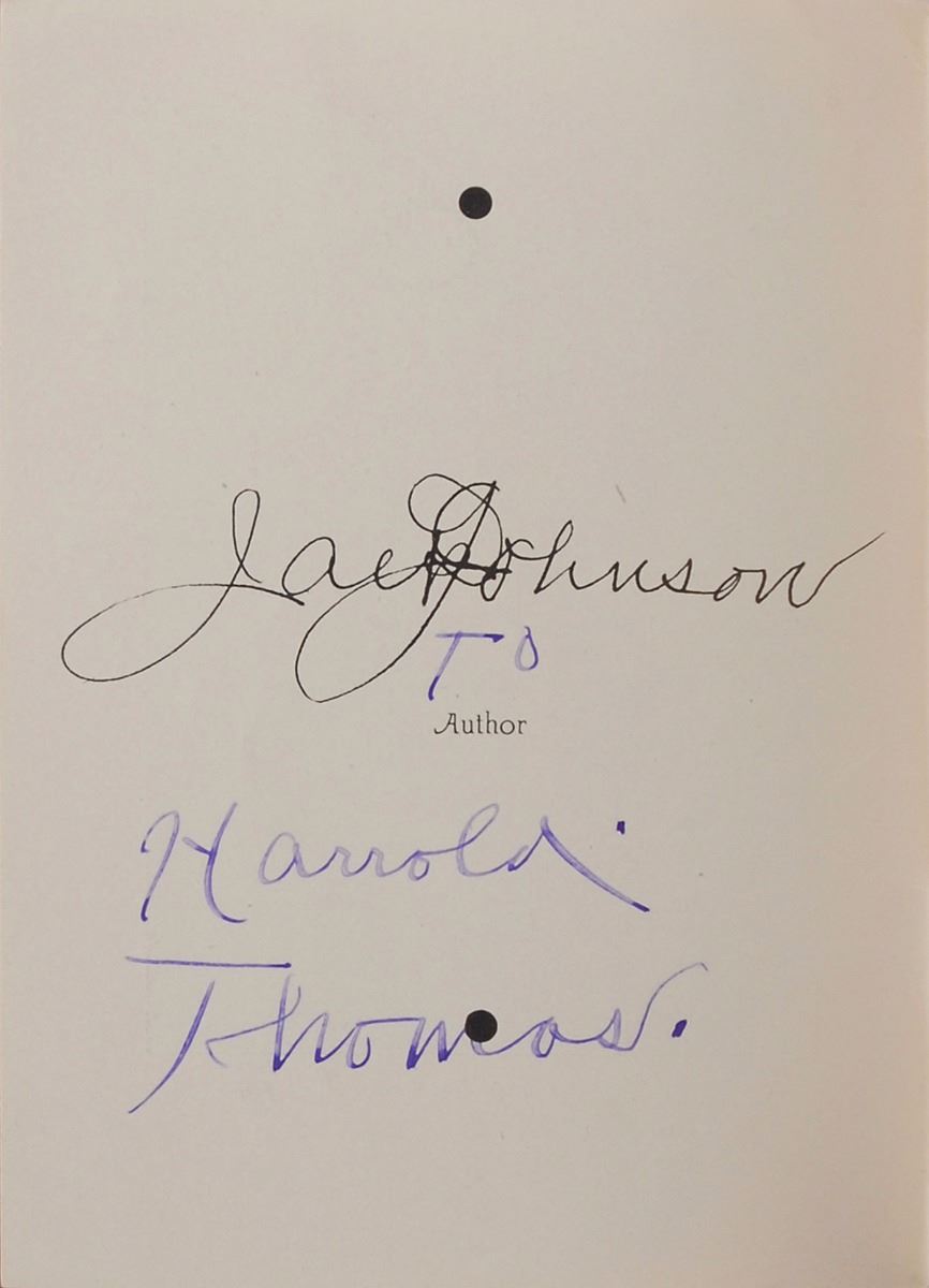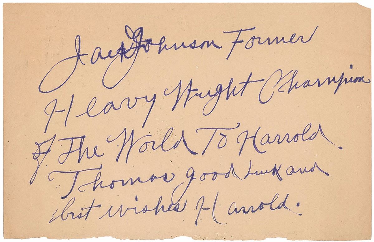 Large, boldly penned ink signature and inscription, “Jack Johnson Former Heavy Weight Champion of The World To Harrold Thomas good luck and best wishes Harrold,” on an off-white 9 x 5.75 sheet. Also includes a scarce 1931 softcover booklet entitled Jack Johnson, The Man, inscribed by Johnson on a page bearing his facsimile signature, “To Harrold Thomas.” In fine condition. Undoubtedly the largest and boldest Johnson signature we have ever offered, and a uniquely appealing example of the Galveston Giant.