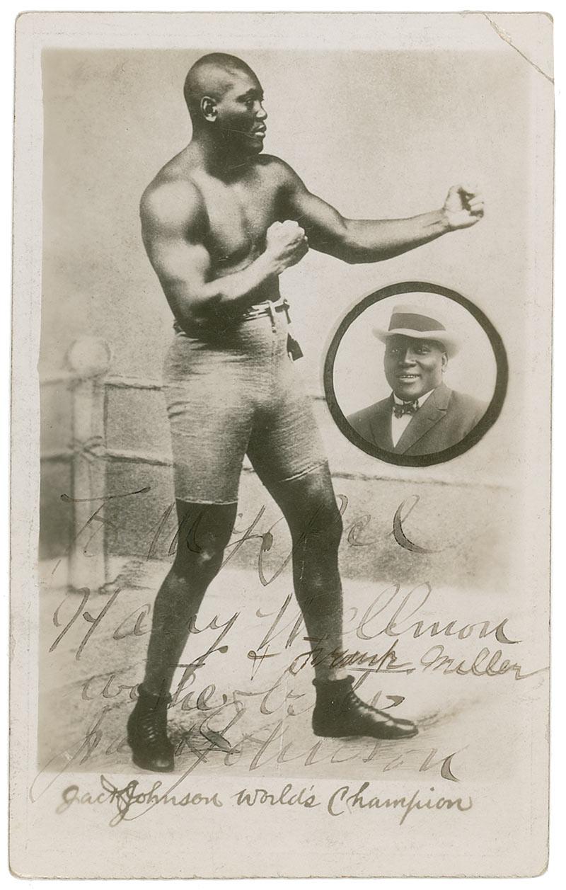 Vintage 3.5 x 5.5 postcard photo, signed and inscribed in fountain pen “To My Pal Harry Hellmon & Frank Miller, Wishes best, Jack Johnson.” In very good condition, with creased upper right corner (reinforced with archival tape on reverse), scattered surface wear, and silvering to the darker areas.