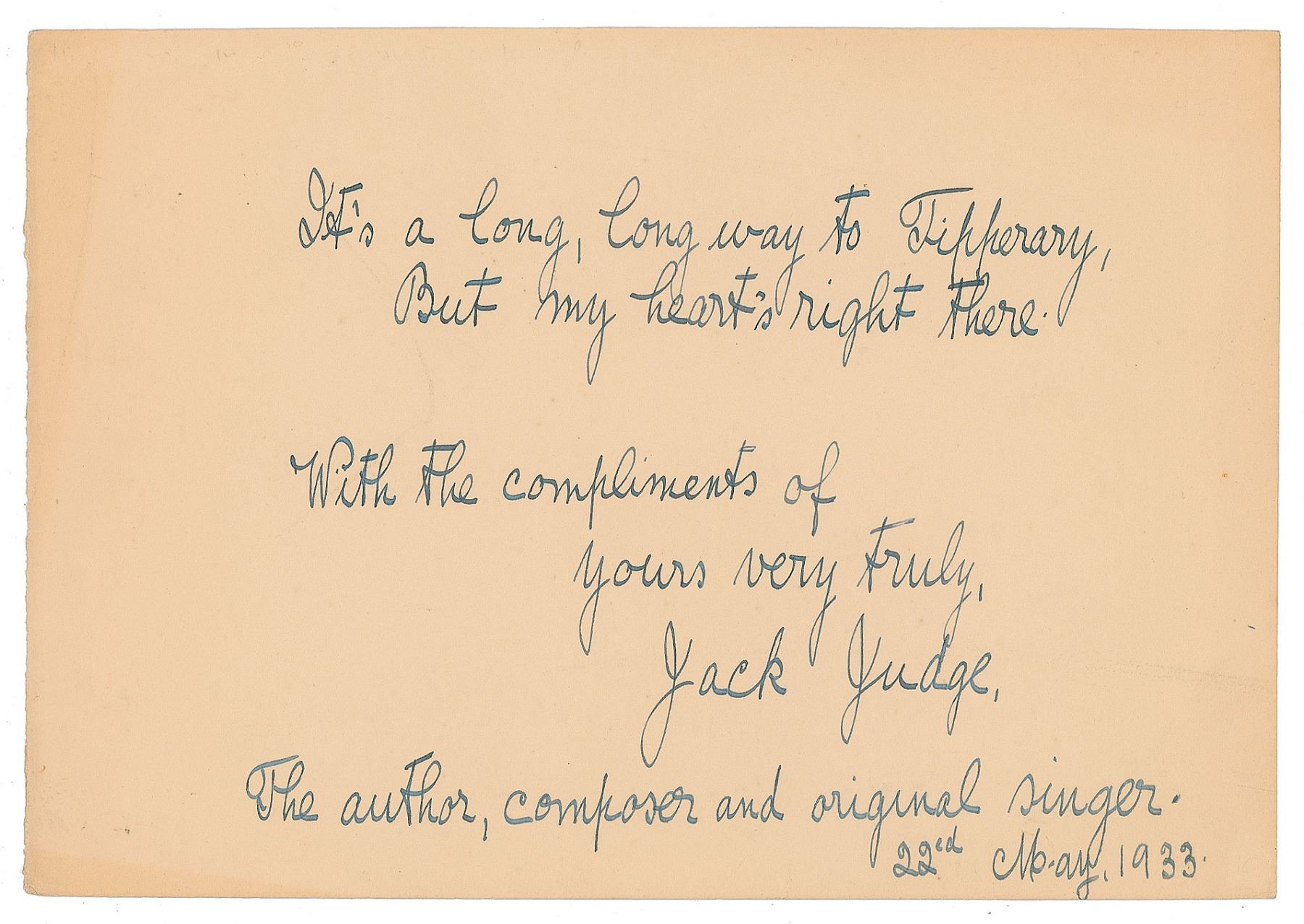 British songwriter and music-hall entertainer (1872–1938) best remembered for writing the song 'It's a Long Way to Tipperary,' which was made famous by John McCormack. AQS on an off-white 10 x 7 card, signed at the conclusion in fountain pen, "With the compliments of yours very truly, Jack Judge, The author, composer and original singer, 22nd May 1933." Judge quotes from his famed music hall march: "It's a long, long way to Tipperary, But my heart's right there." In fine condition.