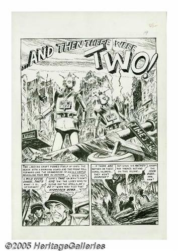 <B>Jack Kamen - Weird Fantasy #6, Splash Page 1 Original Art (EC, 1951).</B></I> Cold War jitters provided the springboard for this science fiction thriller involving nuclear holocaust and artificial life. This distopian tale was titled, "..And Then There Were Two!" The sensational splash featured the opening scenes of the yarn. Fabled "Iron Gods" on remote coral islands were found to be autonomous robots with their own artificial intelligence. Jack Kamen detailed the compelling design of these mechanical marvels. How fitting that his one of his sons, Dean Kamen, inherited the Kamen imagination and grew up to become an inventor of note with his real-world designs for such technological landmarks as a portable drug infusion pump, the Ibot Transporter, and the Segway -- in the Kamen household, science fiction became science fact. Thank you, Jack Kamen! This page featured a gorgeous dry-brush technique, a distinctive Jack Kamen specialty. The image area of the page measures 13" x 18", and the art is in Excellent condition. Enjoy a sense of wonder with this Jack Kamen science fiction masterpiece!