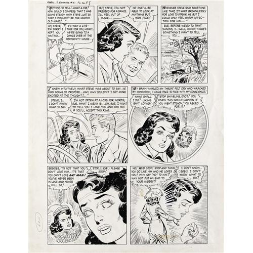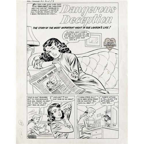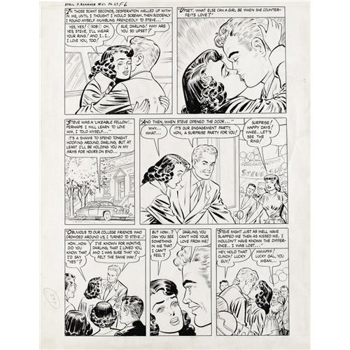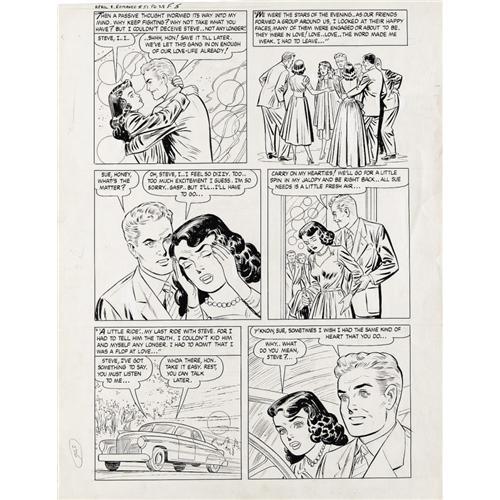 <B>Jack Kamen (attributed) - First Romance Magazine #51 Complete 6-page Story "Dangerous Deception" Original Art (Harvey, 1958).</B></I> "Good girl" specialist and EC alumnus Jack Kamen detailed this melodramatic masterpiece - one of the few he drew for Harvey Comics. These pages have an image area of 12" x 18", and, aside from some light aging, the art is in Very Good condition. <BR><BR><B>Important notice:</B> Heritage usually auctions material at the rate of 200-250 lots per hour. On some occasions eBay Live bid software or the Internet may not be able to keep up with the pace of the auction. We recommend placing a realistic absentee bid now as insurance to avoid disappointment. Occasionally the auctioneer may eliminate or reject an eBay Live bid, and the auctioneer may also reopen a lot after the close of the eBay live bidding (usually because we missed an audience bid), and may reject your bid even if it shows you as the winning bidder. By bidding via eBay Live, you agree that Heritage may award the lot to another bidder at its sole discretion under the circumstances described above or any other reasonable circumstances. Since eBay bids are not shown to us until we open the lot on the floor, we treat those bids just like floor bids. In most cases the floor responds before the eBay bid is presented to us, due to Internet lag time, so for consistency we have made it a policy that floor bids are always considered first over tie eBay live bids. Also please note that all Heritage lots purchased through eBay Live carry a 22.5% Buyer's Premium. Please make sure you read the Terms and Conditions before you bid. This lot is being auctioned in conjunction with a live floor auction by Heritage Auction Galleries. All final auction and invoice information will be supplied by Heritage Auction Galleries, and all other information should be considered preliminary. Lot:41001 <BR><BR><B>Winning Notification and Billing:</B> After the FINAL session in this auction is complete, Heritage will send e-mail and snail mail invoices. This process normally takes several days. All final auction and invoice information will be supplied by Heritage Auction Galleries, and all other information should be considered preliminary. <BR><BR>This auction will be conducted on a live auction floor and over the Internet through eBay Live. If you choose to place an absentee bid, please take a moment to <font color='#0000ff'><u><a href='http://pages.ebay.com/liveauctions/help/before/laabsentee.html'>learn how eBay Live absentee bidding works</a></u></font><font color='#000000'>