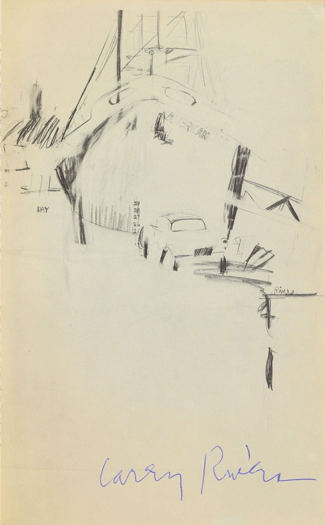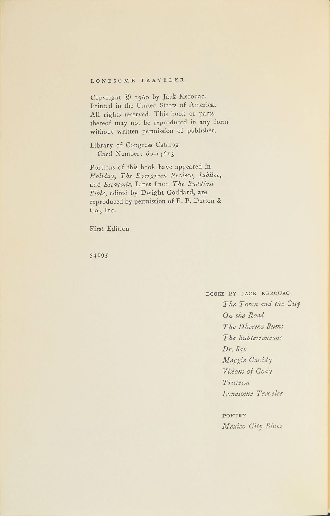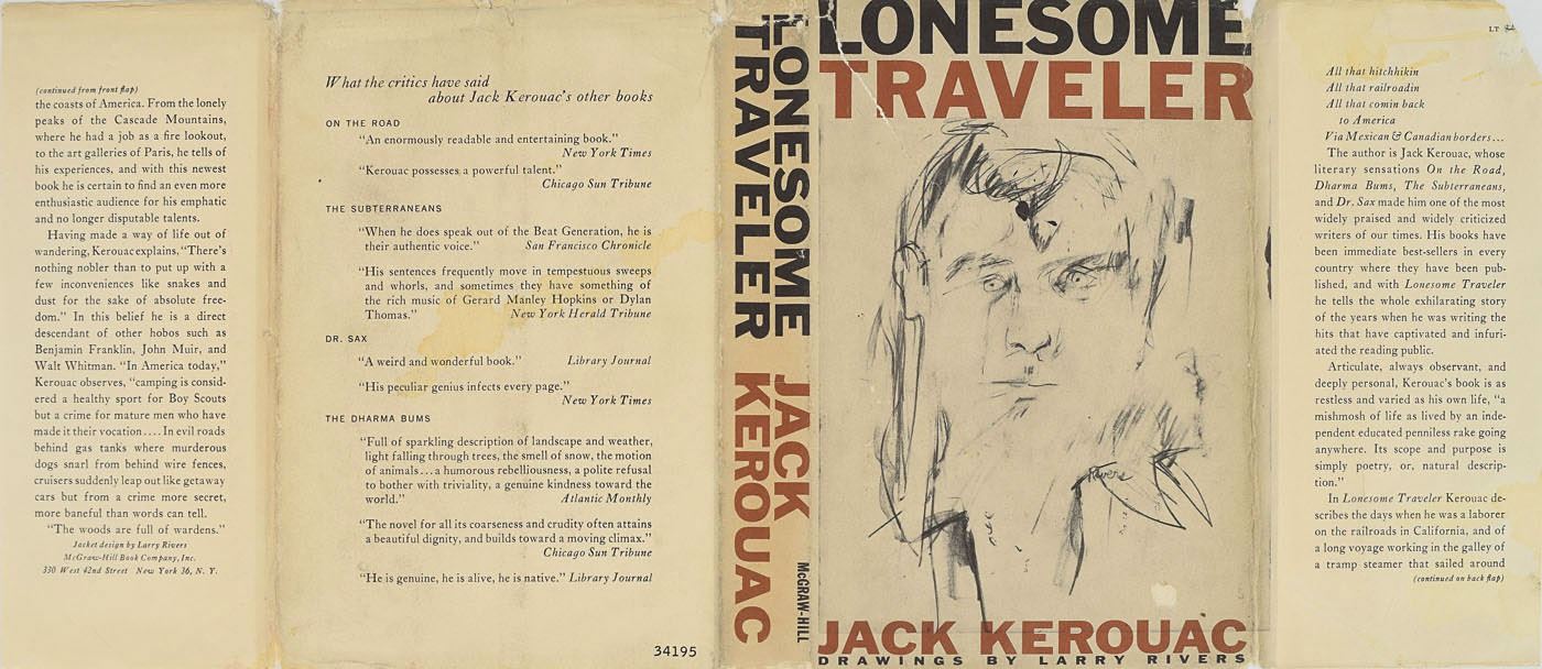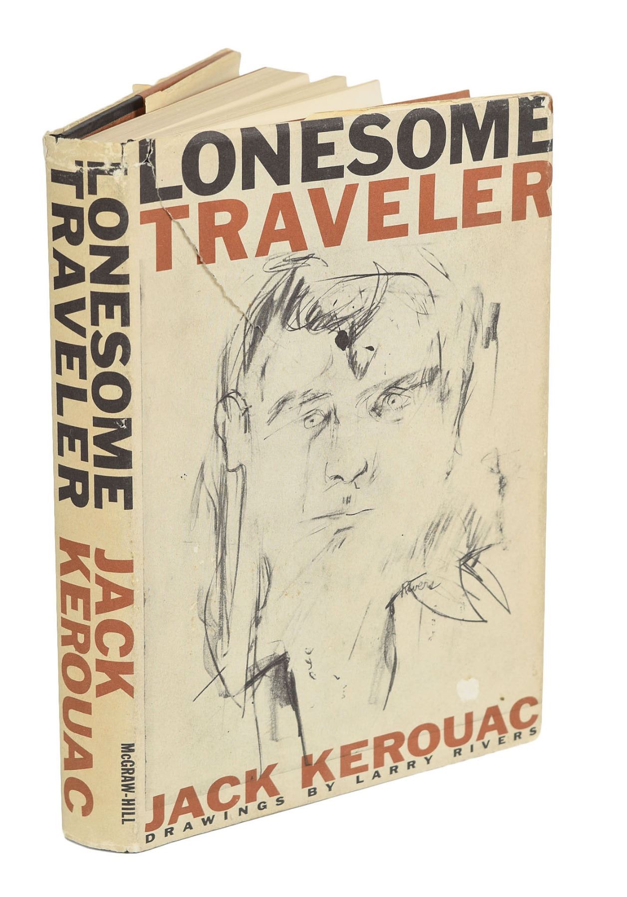 Signed book: Lonesome Traveler by Jack Kerouac. First edition. NY: McGraw-Hill, 1960. Hardcover with dust jacket, 6 x 8.5, 183 pages. Signed on the first illustration in blue ballpoint by the artist, "Larry Rivers." Book Autographic condition: fine. Book condition: VG+/VG, with wear, stains, small areas of surface loss, and a few edge tears to the price-clipped dust jacket.