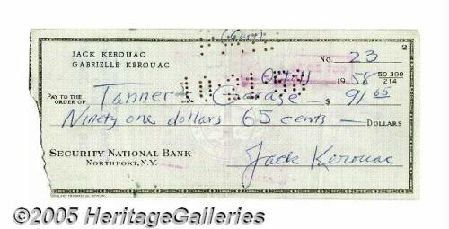 <B>Jack Kerouac Rare Personal Check.</B></I> The writer of classics like "On the Road" and "Dharma Bums," Jack Kerouac's nonconformist, unedited style helped make him the leader and spokesman for the Beat generation. Offered here is a rare personal check filled out and signed by Kerouac, payable to Tanner's Garage for $91.65 and dated October 11, 1958, accompanied by an unsigned photo of the author. In very good condition with the usual cancellation holes and stamps, a vertical fold, and chipped left edge. <I>With COA from PSA/DNA.</B></I>