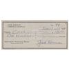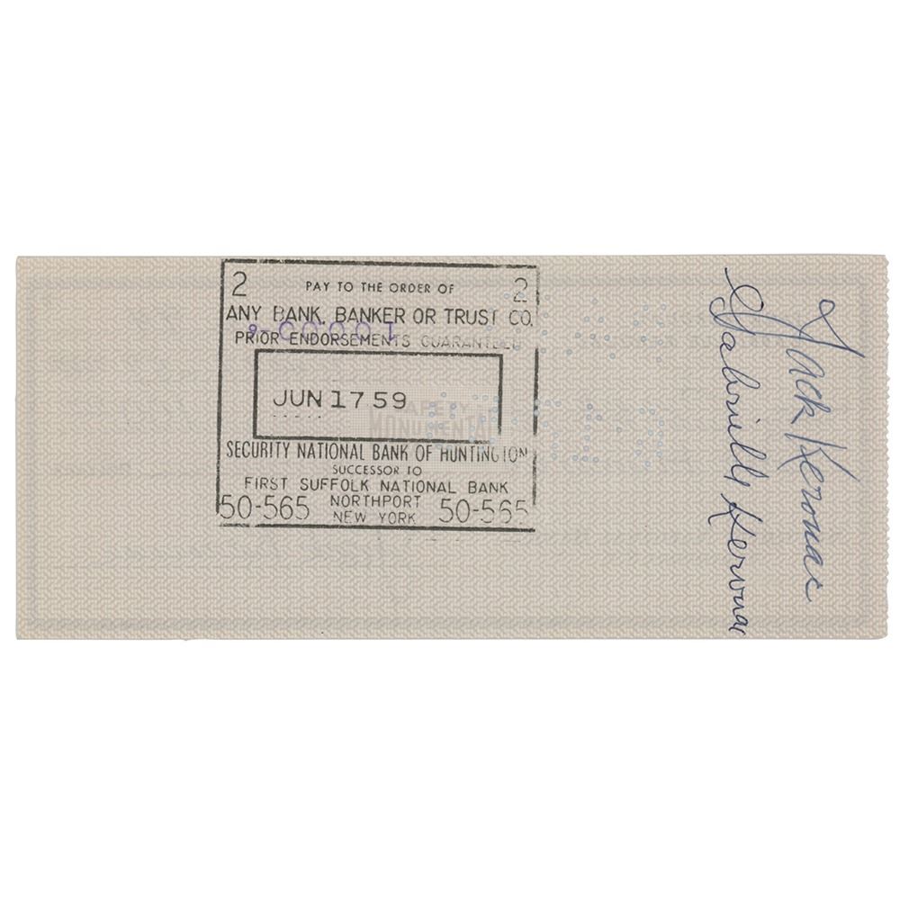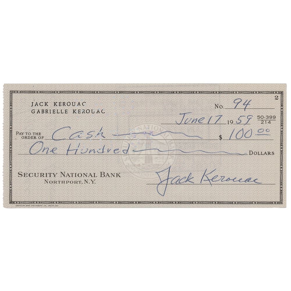 Personal check, 6.25 x 2.75, filled out and signed by Kerouac, "Jack Kerouac," payable to cash for $100, June 17, 1959; also endorsed on the reverse by Kerouac and his mother, "Jack Kerouac" and "Gabrielle Kerouac." In fine condition. Kerouac and his mother lived in Northport, New York, between 1958 and 1964.
