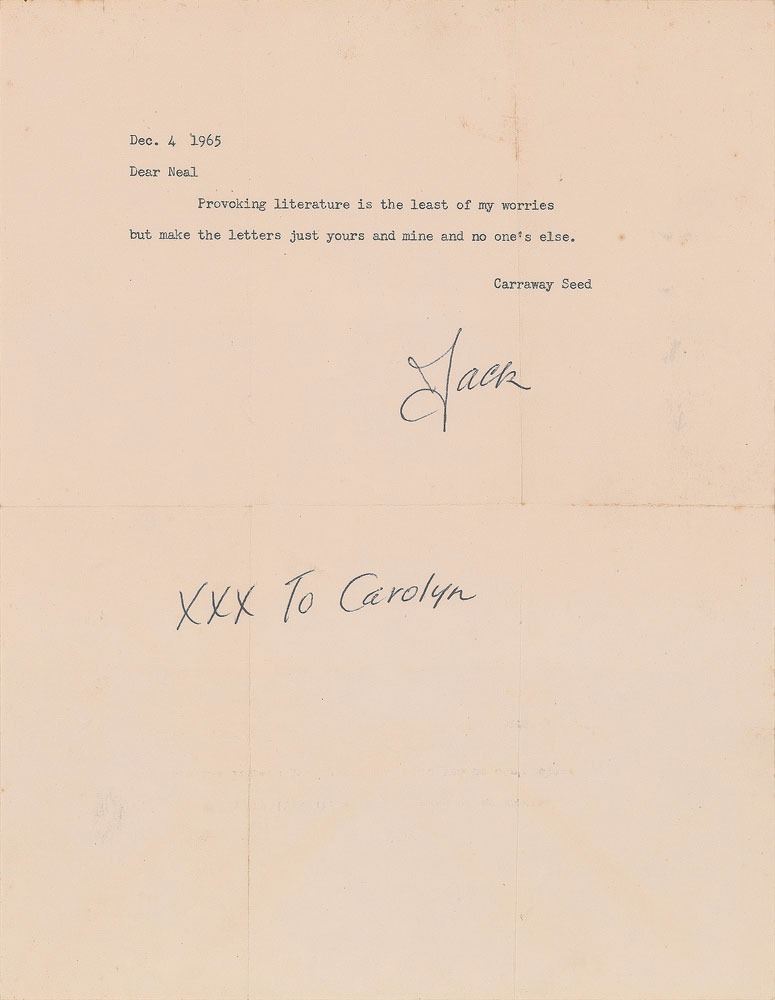 TLS signed “Jack,” one page, 8.5 x 11, December 4, 1965. Letter to famed Beat Generation figure Neal Cassady, in full: "Provoking literature is the least of my worries but make the letters just yours and mine and no one's else. Carraway Seed." He adds a handwritten postscript, "xxx to Carolyn." In fine condition. Accompanied by the original mailing envelope addressed in Kerouac's hand to "Mr. Neal Cassady, 18234 Bancroft Ave, Monte Sereno, California, Los Gatos," most of which has been crossed out and redirected by a postal worker to "c/o Ken Kesey, Star Route #1, La Honda."