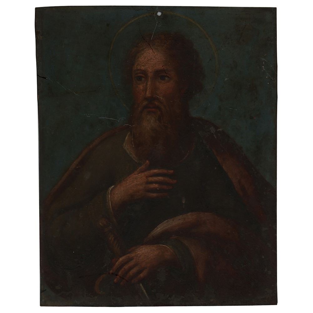Jack Kerouac's personally-owned icon of St. Paul, oil on copper plaque measuring 5.5 x 6.75, which depicts Paul the Apostle with halo and his martyr sword. The plaque is pierced near the top edge for hanging. In fine condition, with light overall wear. Accompanied by a certificate of authenticity signed by John Shen-Sampas, the executor of the Kerouac Estate by descent. John Shen-Sampas is the son of John Sampas, who was the brother-in-law of Jack Kerouac, and the brother of Stella Kerouac, Jack's wife.