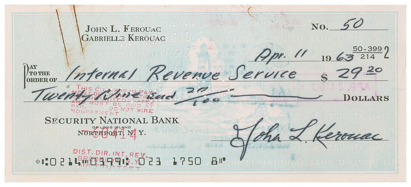 Personal check, 6.25 x 2.75, filled out and signed by Kerouac, “John L. Kerouac,” payable to Internal Revenue Service for $29.20, April 11, 1963. Stamps to both sides, expected cancellation holes, and a rusty paperclip mark to top edge, otherwise fine condition.