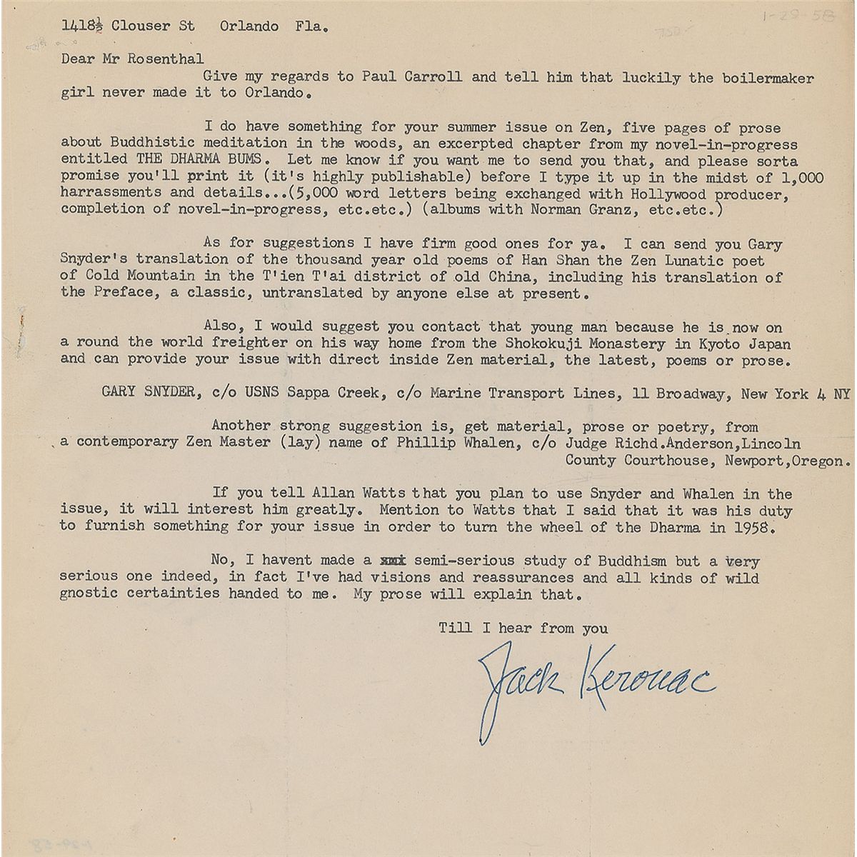 TLS, one page, 8.5 x 8.5, no date, but postmarked January 29, 1958. Letter to Irving Rosenthal at the Chicago Review. In part: “I do have something for your summer issue of Zen, five pages of prose about Buddhistic meditation in the woods, an excerpted ch