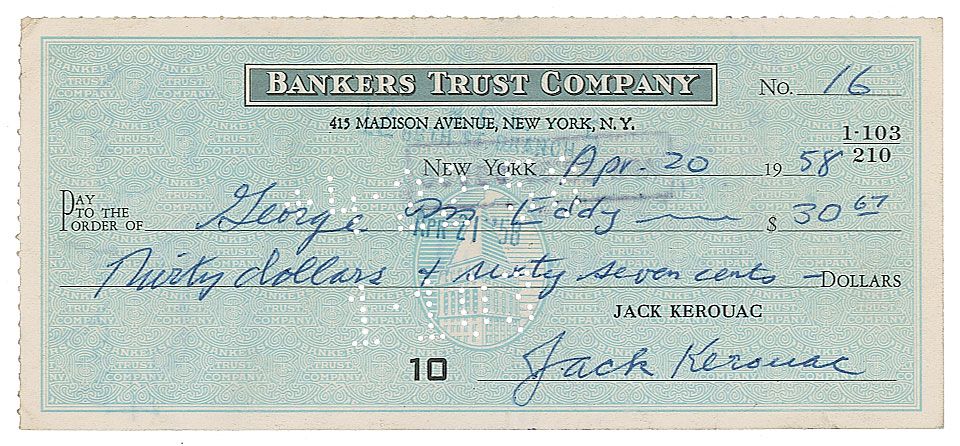 Bank check, 6.25 x 2.75, filled out and signed by Kerouac, payable to George M. Eddy for $30.67, April 20, 1958. A few creases and expected bank stamps and cancellation holes, otherwise fine condition.