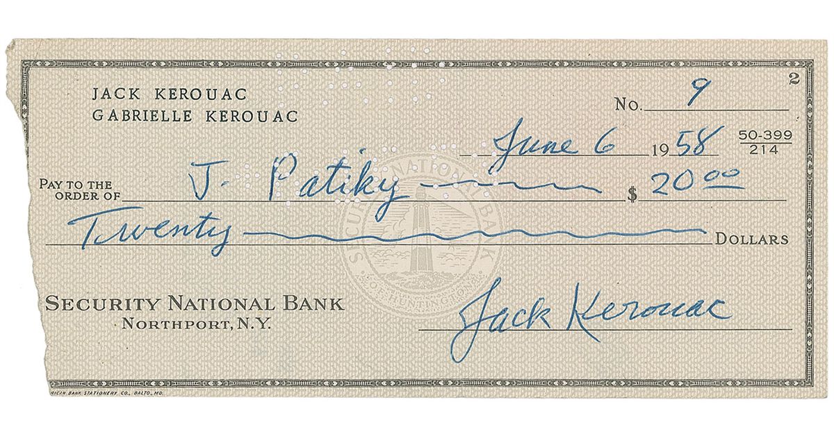 Personal check, 6 x 2.5, filled out and signed by Kerouac, payable to J. Patiky for $20.00, June 6, 1958. In very good condition, with a central vertical fold, cancellation holes to upper portion, and paper loss to left edge. Patiky was a Northport, Long Island, auctioneer.