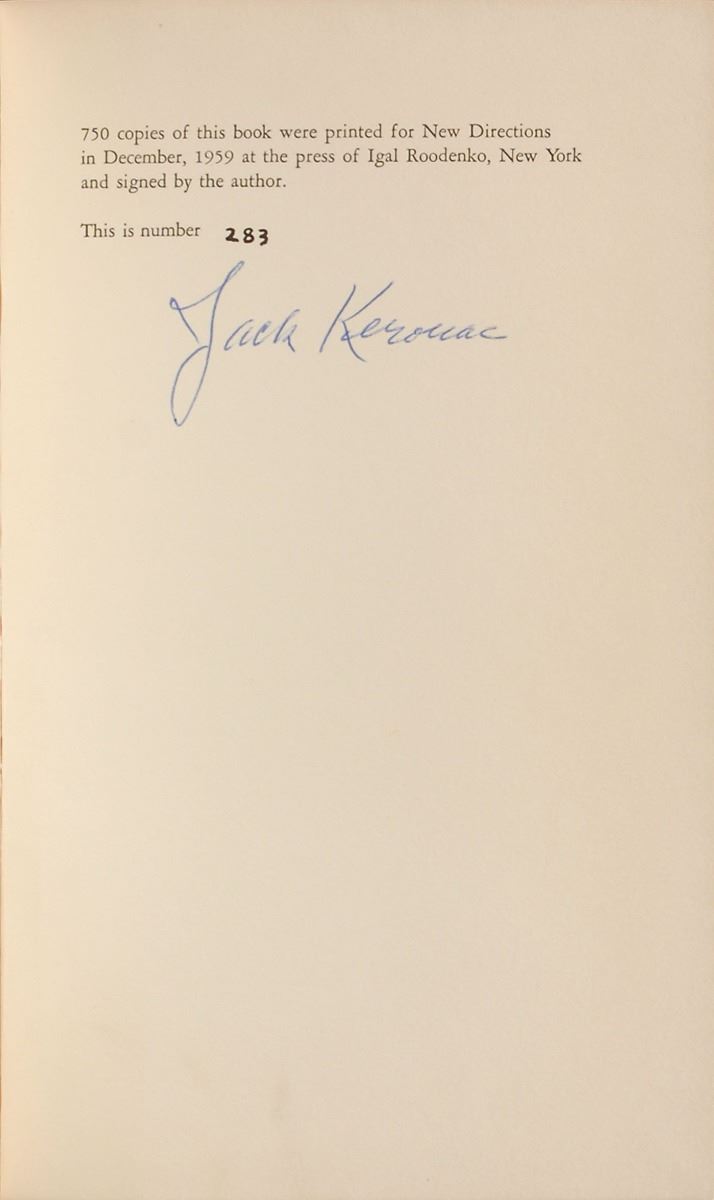 Signed book: Visions of Cody. First edition, limited issue, numbered 283/750. NY: New Directions, 1960. Hardcover, 5.25 x 8.5, 128 pages. Signed on the colophon in blue ballpoint. Autographic condition: fine. Book condition: G+/None, with ex-library label remnants and adhesive to endpapers. Visions of Cody recapitulates many of the events in On the Road and is heavily focused on the character of Neal Cassady. Kerouac considered it to be his masterwork.