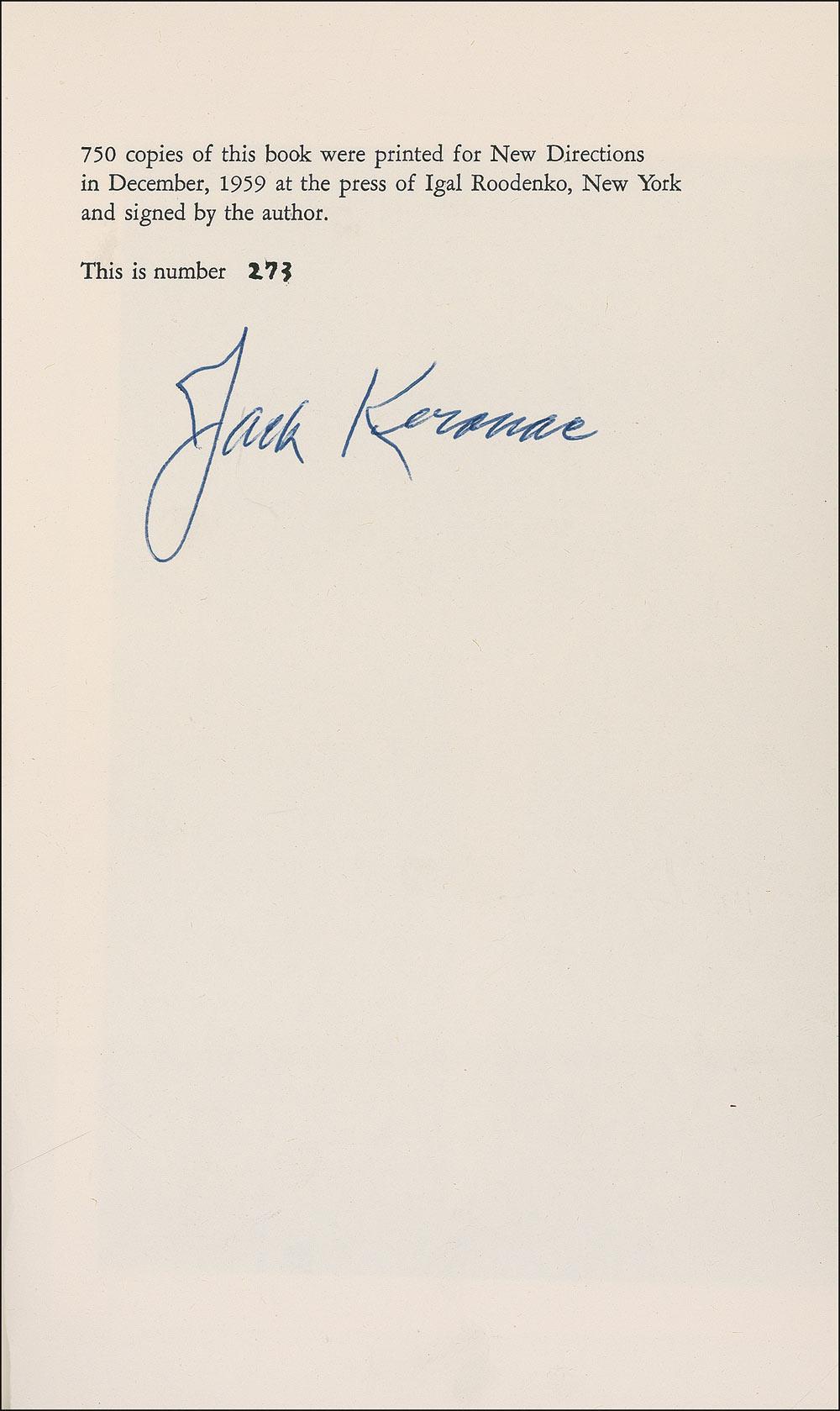 Signed book: Visions of Cody. Special limited edition of 750 copies (this being #273). NY: Igal Roodenko, 1960. Hardcover, 5.5 x 8.5, 128 pages. Signed in blue ink on the colophon page. A tight, clean copy in fine condition. Pre-certified PSA/DNA and RRAuction COA.