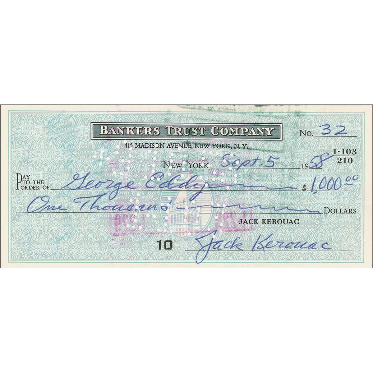 Highly influential American writer (1922–1969) widely acknowledged as the most dynamic and brilliant figure of the “Beat” movement. His classic autobiographical novel, On the Road (1957) takes a place among the high points of 20th-century American literature. Bank check, 6.25 x 2.75, filled out and signed by Kerouac, payable to George Eddy for $1000.00, September 5, 1958. In fine condition, with expected holes and stamps, barely affecting first letter of signature, and a bisecting vertical fold.
