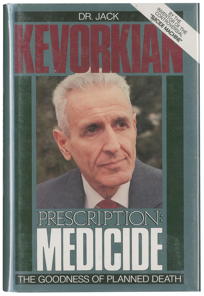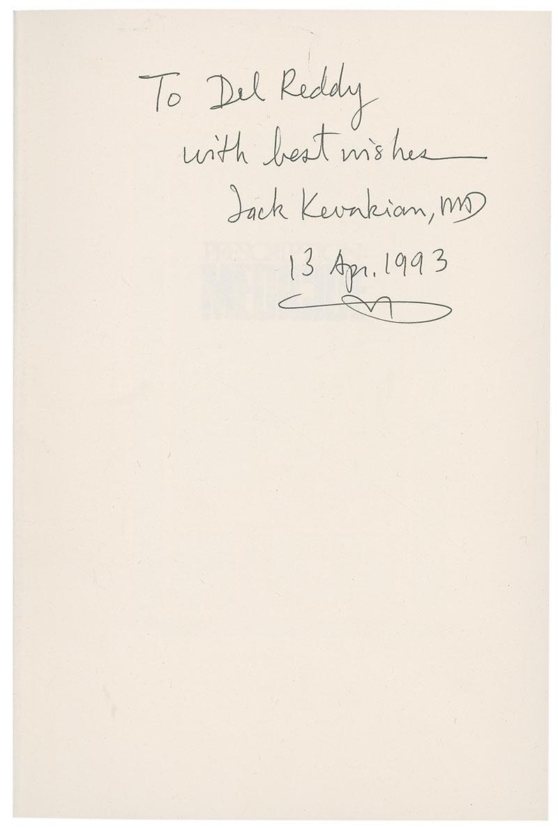 Signed book: Prescription: Medicine. First edition, first printing. Buffalo: Prometheus Books, 1991. Hardcover with dustjacket, 6.25 x 9.25, 268 pages. Signed and inscribed on the first free end page, “To Del Reddy, with best wishes, Jack Kevorkian, MD, 13 Apr. 1993.” In fine condition.