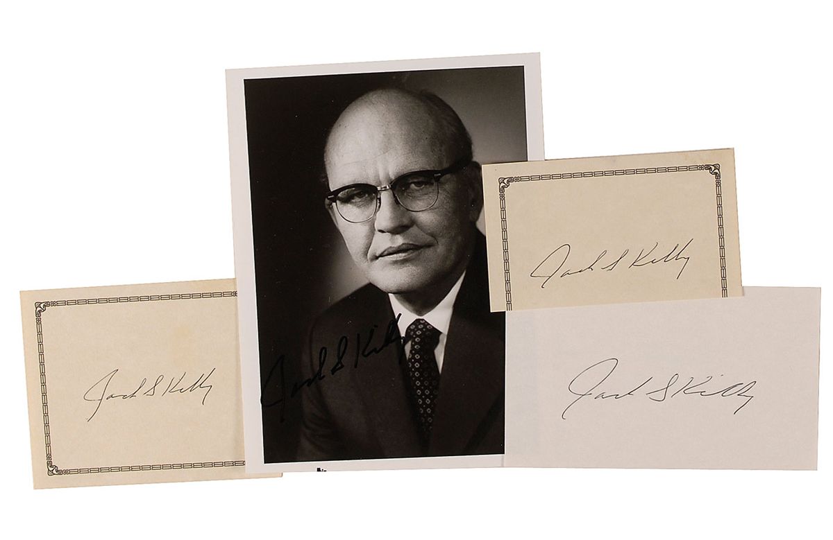 Nobel Prize laureate in physics in 2000 for his invention of the integrated circuit in 1958. Four items: glossy 5 x 7 photo signed in black felt tip; ballpoint signature on an off-white 5 x 3 card; and two ink signatures on different size beige slips. In fine condition, with some light surface marks and light contrast to signature on photo.