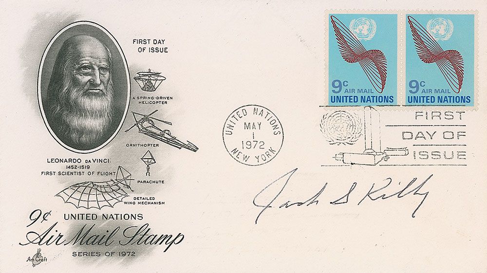 Physicist (1923-2005) who won the Nobel Prize in 2000 for his 1958 invention of the integrated circuit. FDC with a cachet honoring Leonardo da Vinci as the first scientist of flight, signed in black ballpoint. In fine condition, with minor rippling to cachet.