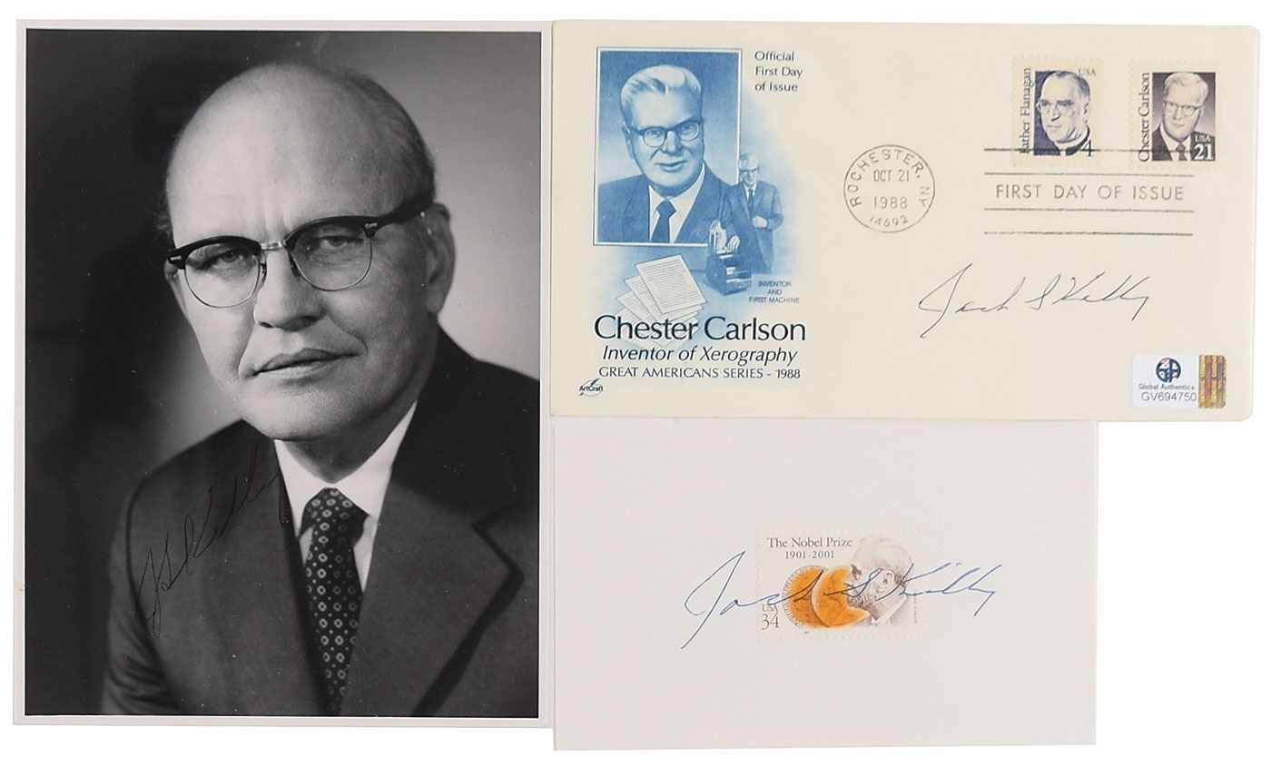 Three items signed in ballpoint by Nobel Prize-winning physicist Jack Kilby: an off-white 5 x 3 card with affixed Nobel Prize stamp; an FDC with a cachet honoring xerography inventor Chester Carlson; and a glossy 5 x 6.5 photo of Kilby. In overall very fine condition, with an authenticity label affixed to lower right corner of FDC.