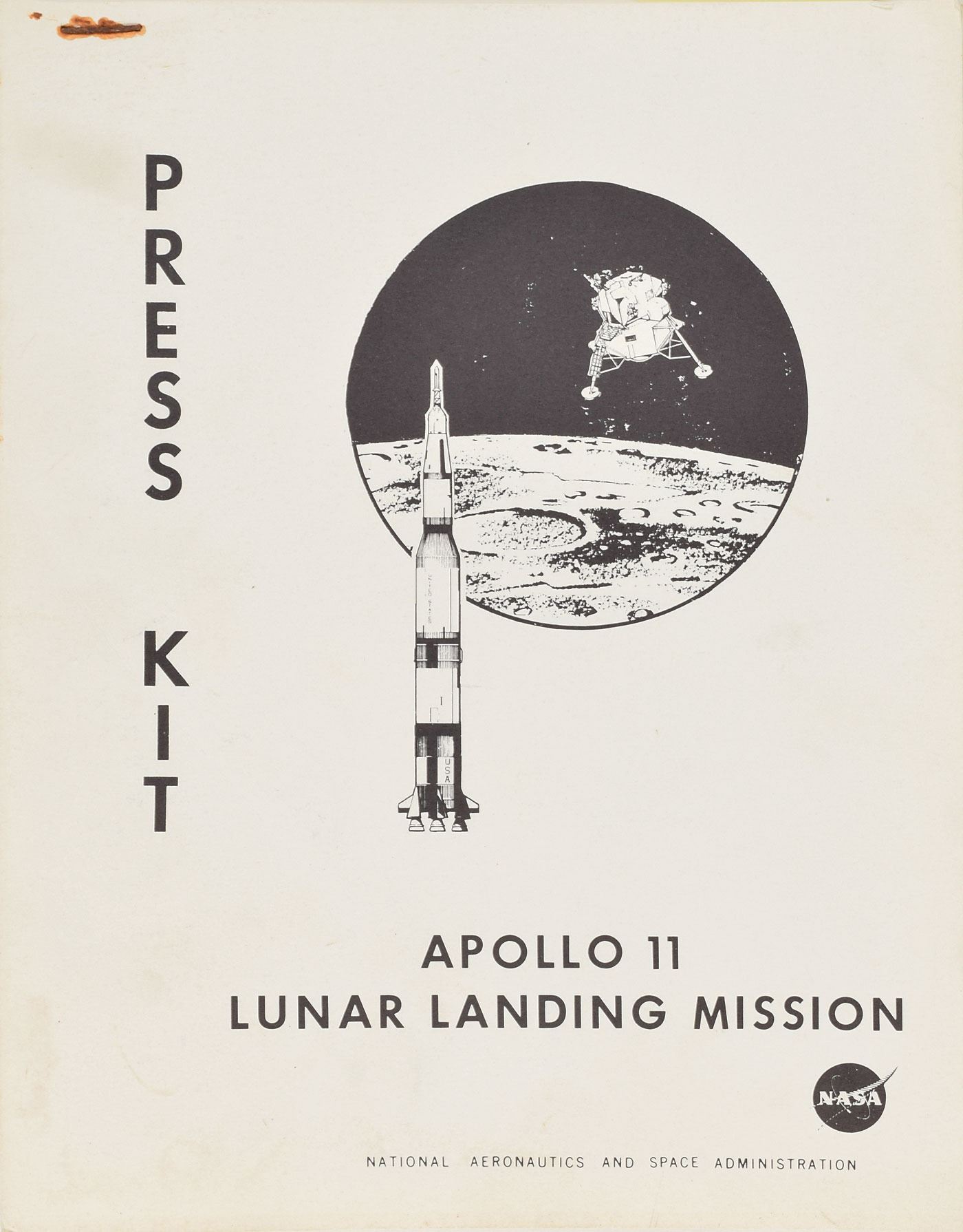 Staple-bound NASA-printed Apollo 11 press kit, 8 x 10.5, 250 pages, dated June 26, 1969. The manual provides detailed information and diagrams related to the first moonwalks, and is divided into several sections: General Release, Apollo 11 Countdown, Launch Events, Apollo 11 Mission Events, Mission Trajectory and Maneuver Description, Recovery Operations, Quarantine, Schedule for Transport of Samples, Spacecraft & Crew, Lunar Receiving Laboratory Procedures Timeline, Apollo 11 Go/No–Go Decision Points, Apollo 11 Alternate Missions, Abort Modes, Onboard Television, Photographic Tasks, Lunar Description, Command and Service Module Structure, Systems, Lunar Module Structures, Weight, Saturn V Launch Vehicle Description & Operation, Apollo 11 Crew, Early Apollo Scientific Experiments Package, Apollo Lunar Radioisotopic Heater, Apollo Launch Operations, Launch Complex 39, Manned Space Flight Network, Contamination Control, Apollo Program Management, and Principle Investigators and Investigations of Lunar Surface Samples. In fine condition. From the personal collection of Jack King, who served as the Kennedy Space Center Chief of Public Information during projects Mercury, Gemini and Apollo. King provided public announcements and commentary for several of the mission launches, including the announcement of the Apollo 11 launch, which earned him the nickname ‘Voice of Apollo.’ Originating from the Astronaut Scholarship Foundation, a portion of the proceeds for the sale of this item will be donated to the ASF.