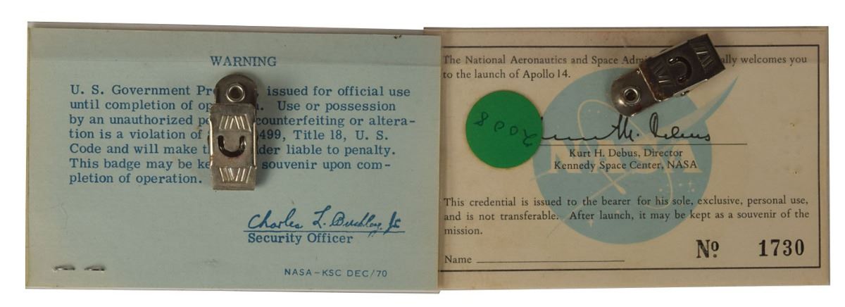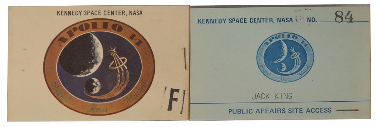 Kennedy Space Center Chief of Public Information during projects Mercury, Gemini and Apollo (1931–2015) who provided public announcements and commentary for several of the mission launches, including the announcement of the Apollo 11 launch, which earned him the nickname ‘Voice of Apollo.’ Pair of original laminated NASA Kennedy Space Center badges for Apollo 14, each 4 x 2.5, including: a public affairs site access pass issued to Jack King, stamped "84"; and a launch day pass for Apollo 14 bearing the mission insignia, stamped on the reverse "1730." In overall fine condition. Originating from the Astronaut Scholarship Foundation, a portion of the proceeds for the sale of this item will be donated to the ASF.