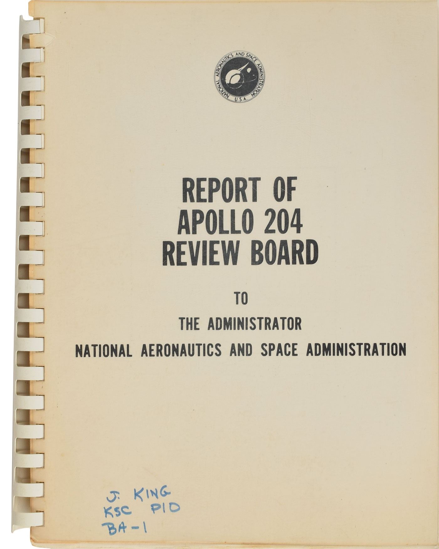 Scarce NASA-printed manual for the “Report of Apollo 204 Review Board to the Administrator National Aeronautics and Space Administration,” 8.5 x 10.75, 114 pages (with supplementary pages featuring color images and diagrams of the Apollo 1 accident and capsule), April 5, 1967. The review board was charged with the responsibility of reviewing the circumstances surrounding the Apollo 1 (AS–204) accident, reporting its findings relating to the cause of the accident, and formulating recommendations so that inherent hazards are reduced to a minimum. The manual consists of six parts: Authority, Biographies, Board, History of the Accident, Investigation and Analysis, and Findings, Determinations and Recommendations. The lower left front cover annotated in blue felt tip: “J. King, KSC P10, BA–1.” In fine condition. Jack King served as the Kennedy Space Center Chief of Public Information during projects Mercury, Gemini and Apollo, who provided public announcements and commentary for several of the mission launches, including the announcement of the Apollo 11 launch, which earned him the nickname ‘Voice of Apollo.’ Originating from the Astronaut Scholarship Foundation, a portion of the proceeds for the sale of this item will be donated to the ASF.