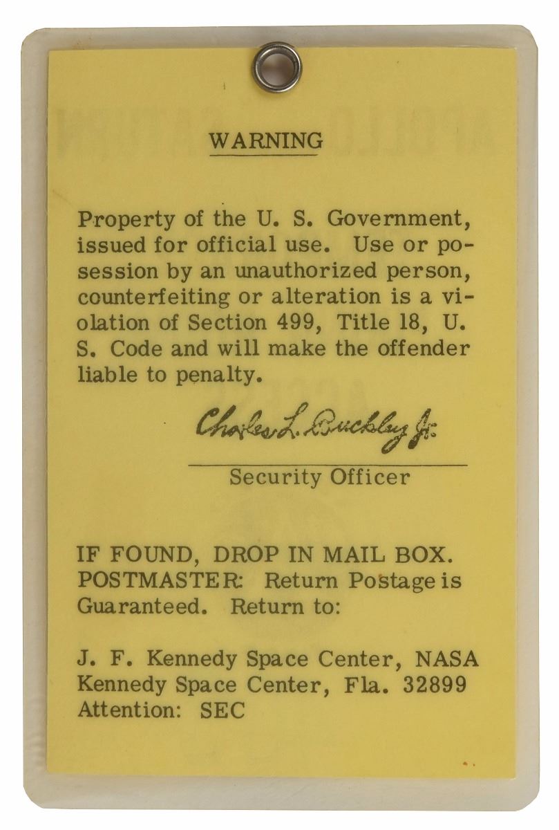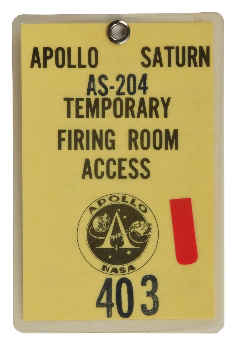 Kennedy Space Center Chief of Public Information during projects Mercury, Gemini and Apollo (1931–2015) who provided public announcements and commentary for several of the mission launches, including the announcement of the Apollo 11 launch, which earned him the nickname ‘Voice of Apollo.’ Original laminated NASA Kennedy Space Center badge, 2.5 x 3.75, issued for temporary access of the Apollo Saturn firing room for AS-204, stamped "403" with red label. In fine condition. The Apollo 1 mission was initially designated as AS-204, which was named after its Saturn rocket. Following the tragic fire at Launch Complex 34, the undamaged launch vehicle was later reassembled and reused for the test flight of Apollo 5. Originating from the Astronaut Scholarship Foundation, a portion of the proceeds for the sale of this item will be donated to the ASF.