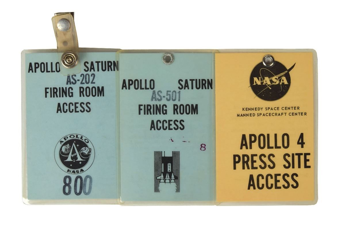 Kennedy Space Center Chief of Public Information during projects Mercury, Gemini and Apollo (1931–2015) who provided public announcements and commentary for several of the mission launches, including the announcement of the Apollo 11 launch, which earned him the nickname ‘Voice of Apollo.’ Three original laminated NASA Kennedy Space Center badges, each 2.5 x 3.75, including: an Apollo Saturn firing room access pass for AS-501; an Apollo Saturn firing room access pass for AS-202, stamped "800"; and a press site access pass for Apollo 4. In overall fine condition. The Saturn V SA-501 was the rocket used to launch the Apollo 4 test flight. Originating from the Astronaut Scholarship Foundation, a portion of the proceeds for the sale of this item will be donated to the ASF.