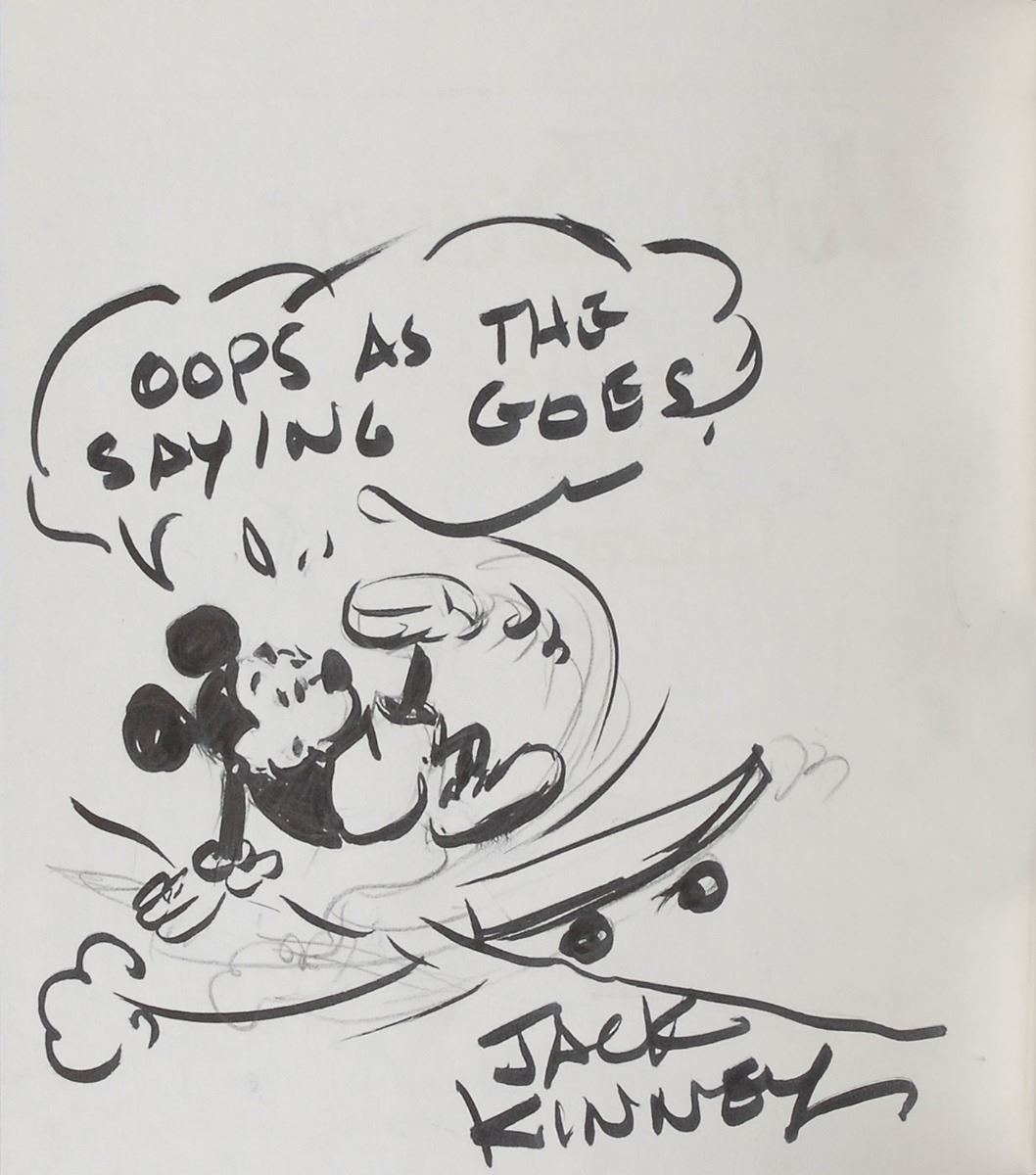 Signed book: Walt Disney and Assorted Other Characters. First edition, first printing. NY: Harmony Books, 1988. Hardcover with dust jacket, 8.25 x 8.75, 207 pages. Signed opposite the title page in black felt tip, “Jack Kinney,” along with a fantastic full-page sketch of Mickey Mouse riding a skateboard, saying, “Oops as the saying goes.” In fine condition.