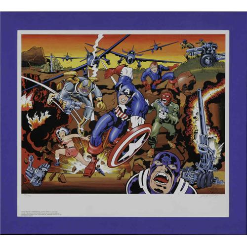 <B>Jack Kirby - Captain America Fiftieth Birthday Commemorative Lithograph Print #545/950 (First Team Press, 1992).</B></I> Who better to create this masterpiece than Captain America's original creator, Jack Kirby? Drawn in classic Kirby style this fiftieth anniversary commemorative includes several of his arch enemies and, of course, his side kick Bucky. This original edition was limited to 950 copies for general release. Published on a luxurious 120 pound acid free imported art stock, this stunning print measures approximately 24" x 20", and is in Excellent condition. Signed and numbered by Jack Kirby at the lower right. Includes a certificate of authenticity. As a bonus, you'll get a 12" x 15" black and white "Fiftieth Birthday Commemorative" lithograph pencil sketch created by Kirby, which also includes a certificate of authenticity. Some markings along the extreme edges (outside of the image area); otherwise in Excellent condition.