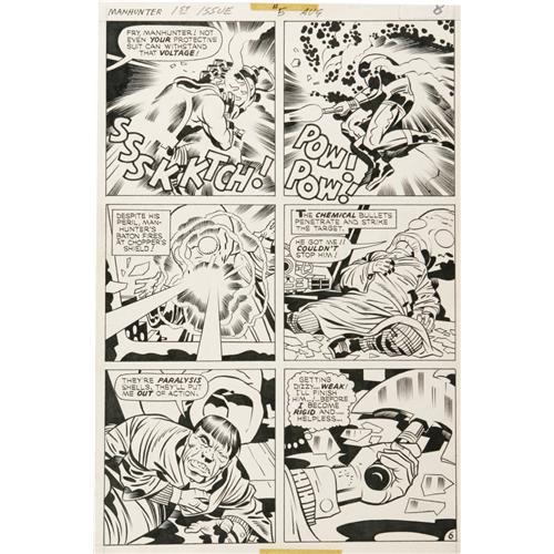 While the Chopper's devastating electric killing machine does its damage, the Manhunter strikes the serial killer with a volley of paralysis bullets to take him out of action, in this page is from "The Electric Head." Written and penciled by Jack Kirby and inked by D. Bruce Berry, the image area measures 10" x 15". Aside from some tape residue staining at the upper and lower edge, the condition is Very Good.<BR><BR><b>Shipping:</b> Small Flat (<a target="_blank" href="http://www.heritageauctions.com/common/shipping.php">view shipping information</a>)