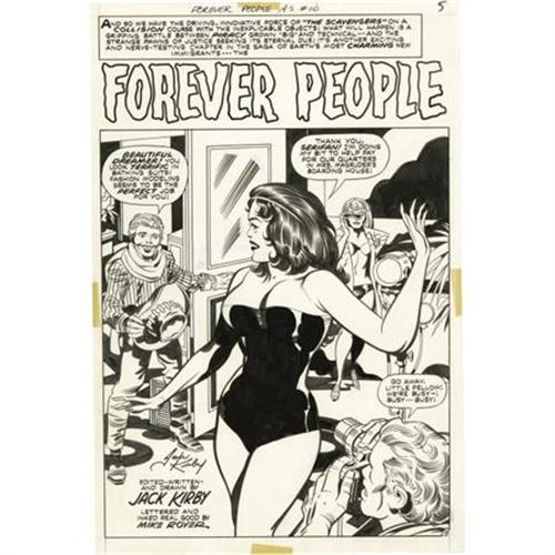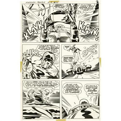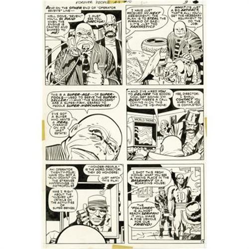 <B>Jack Kirby and Mike Royer - The Forever People #10, Complete 22-page Story "The Scavengers" Original Art (DC, 1972). </B></I> From the Firepits of Apokolips to the glittering spires of New Genesis, Jack Kirby's astounding Fourth World epic burst fully-formed on an unsuspecting world in 1970, when Kirby moved to DC after years at rival Marvel. First appearing in Superman's Pal, Jimmy Olsen, the Fourth World storyline soon spawned three brand-new titles: The New Gods, Mister Miracle, and The Forever People, from which this particular story hails. The "younger generation" of New Genesis, the Forever People traveled Earth battling the evil minions of Darkseid. This story, the next-to-last issue of this key title and one of the best of the run, features Deadman, and also showcases a last panel advertisement for Kirby's new book, The Demon (the ad is original art, not a pasted-up stat). The Fourth World books are fondly remembered and original art from these books is hotly sought-after and collected. Most of the books have been broken up over the years, making complete stories scarce. Kirby was one of the greatest talents the comics industry has ever seen, making this a not-to-be-missed opportunity to acquire a complete Bronze Age masterpiece based on Kirby's mythic vision. Each page of this blockbuster has an approximate image area of 10" x 15", and the art is in Excellent condition.<BR><BR><b>Shipping:</b> Flat Material, Small (<a target="_blank" href="http://www.heritageauctions.com/common/shipping.php">view shipping information</a>)
