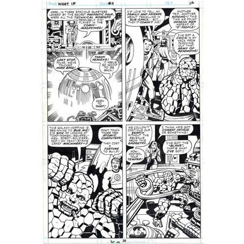 <B>Jack Kirby, Mike Royer, and Bill Wray - What If? #11, page 26 Original Art (Marvel, 1978).</B></I> Face front, True Believers -- here's a hallowed piece of Marvel lore! In this unforgettable and offbeat yarn from <B>What if?</B></I> #11, the parts of the Fantastic Four were played by members of the original Marvel bullpen. Smilin' Stan Lee is Mr. Fantastic, Jolly Solly Brodsky is the Human Torch, Fabulous Flo Steinberg is the Invisible Girl, and Jack "King" Kirby is the ever-lovin, blue-eyed Thing (natch). Besides the fab four, this page also features the Watcher and more "Kirby-tech" gizmos than you can shake a Forbush Man at. Mike Royer and Bill Wray added a slick finish to Kirby's pencils that rivals that of Joe Sinnott himself. The image area of this page measures 10" x 15", and the art is in Excellent condition.