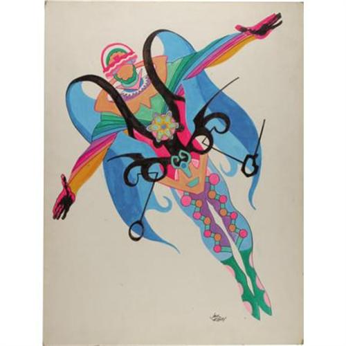<B>Jack Kirby - Psychedelic Pin-Up Illustration Original Art (circa 1969).</B></I> For many Baby Boomers, Marvel Comics' flawed heroes (dialogued with a tongue-in-cheek irreverence by Stan Lee, and set loose in cosmic settings pictured by Jack Kirby) were no less a force in the 1960s pop culture renaissance than the Beatles were with their rock n' roll music. Novelist Jonathan Lethem, in an essay, even compared the supremely creative collaboration of Stan Lee and Jack Kirby with that of John Lennon and Paul McCartney. Direct from the eve of the Silver Age comes this electrifying "King" Kirby icon, rendered in fluorescent hues. The glowing aerialist displays an energetic euphoria, as though he has at last broken free from a blacklight-filled universe! One of a series of four paintings of this type (displayed in The Jack Kirby Collector #19), this eye-popping pin-up has an image area measuring 19" x 26". The art is in Excellent condition and was signed by Jack Kirby at the bottom right. <I> From the Fantastic Frank Collection.</B></I><BR><BR><b>Shipping:</b> Flat Material, Large (<a target="_blank" href="http://www.heritageauctions.com/common/shipping.php">view shipping information</a>)