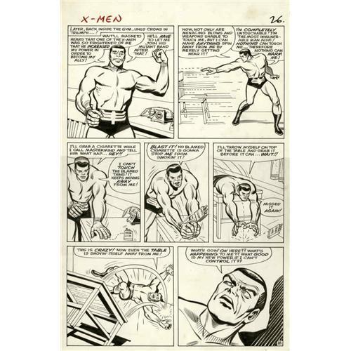 <B>Jack Kirby and Chic Stone - X-Men #8, page 18 (Marvel, 1964).</B></I> <B>X-Men</B></I> art by Jack "King" Kirby does not turn up very often in the marketplace for one main reason -- Kirby only penciled the first eleven issues. Here is an opportunity to own a vintage page showcasing one of the X-Men's almost fearsome foes -- Unus, the Untouchable -- from his first appearance and origin story. This scene marks Unus' Waterloo as the malevolent mutant falls victim to Hank McCoy's plan to increase Unus' "x-power" -- his matter-repelling force field. The image area of this page measures 12.5" x 18.5", and the art is in Excellent condition.