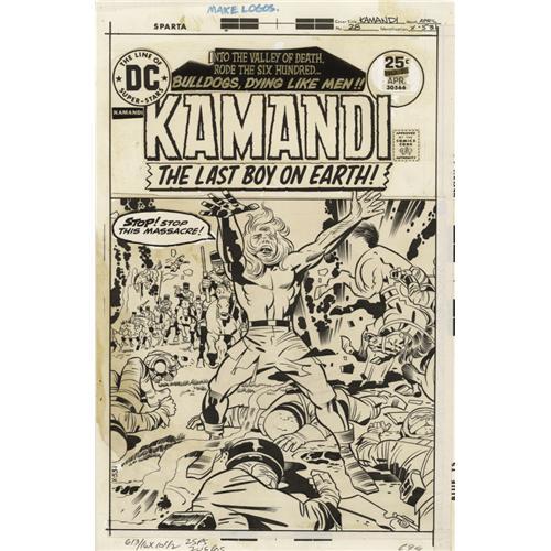 <B>Jack Kirby and D. Bruce Berry - Kamandi #28 Cover Original Art (DC, 1975).</B></I> Into the Valley of Death rode the six hundred - bulldogs, dying like men! Only Jack "King" Kirby could draw the stirring drama and the emotional reaction of Kamandi as he attempts to stop the massacre. Jack Kirby and D. Bruce Berry were an accomplished team in the latter part of the Bronze Age, and this war-torn masterwork is one of their finest works. The piece has an image area that measures 9.75" x 15". The central image was cut and glued to the larger cover stock, as were the type elements. There is some minor discoloration in the masthead blurb; otherwise, the art is in Very Good condition overall. <BR><BR><B>Important notice:</B> Heritage usually auctions material at the rate of 200-250 lots per hour. On some occasions eBay Live bid software or the Internet may not be able to keep up with the pace of the auction. We recommend placing a realistic absentee bid now as insurance to avoid disappointment. Occasionally the auctioneer may eliminate or reject an eBay Live bid, and the auctioneer may also reopen a lot after the close of the eBay live bidding (usually because we missed an audience bid), and may reject your bid even if it shows you as the winning bidder. By bidding via eBay Live, you agree that Heritage may award the lot to another bidder at its sole discretion under the circumstances described above or any other reasonable circumstances. Since eBay bids are not shown to us until we open the lot on the floor, we treat those bids just like floor bids. In most cases the floor responds before the eBay bid is presented to us, due to Internet lag time, so for consistency we have made it a policy that floor bids are always considered first over tie eBay live bids. Also please note that all Heritage lots purchased through eBay Live carry a 22.5% Buyer's Premium. Please make sure you read the Terms and Conditions before you bid. This lot is being auctioned in conjunction with a live floor auction by Heritage Auction Galleries. All final auction and invoice information will be supplied by Heritage Auction Galleries, and all other information should be considered preliminary. Lot:41001 <BR><BR><B>Winning Notification and Billing:</B> After the FINAL session in this auction is complete, Heritage will send e-mail and snail mail invoices. This process normally takes several days. All final auction and invoice information will be supplied by Heritage Auction Galleries, and all other information should be considered preliminary. <BR><BR>This auction will be conducted on a live auction floor and over the Internet through eBay Live. If you choose to place an absentee bid, please take a moment to <font color='#0000ff'><u><a href='http://pages.ebay.com/liveauctions/help/before/laabsentee.html'>learn how eBay Live absentee bidding works</a></u></font><font color='#000000'>