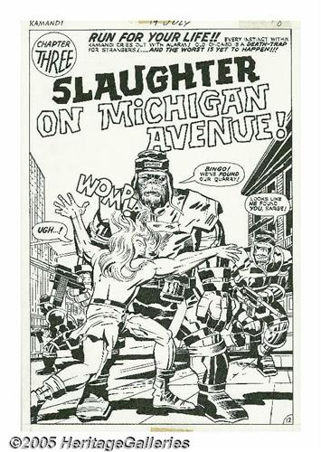 <B>Jack Kirby and D. Bruce Berry - Kamandi, The Last Boy on Earth #19 Splash Page 12 Original Art (Marvel, 1974).</B></I> During a desperate flight from the death trap of Old Chicago, Kamandi, the last boy on Earth, runs smack dab into Sergeant Ugash in the title page of "Slaughter on Michigan Avenue." Bingo! This magnificent page is a prime example of Jack Kirby's uncanny eye for pattern and design. The image area of the page is 10" x 15" and the art is in Excellent condition.