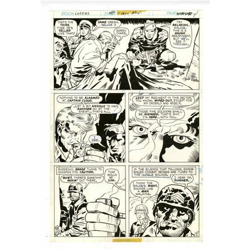 <B>Jack Kirby and D. Bruce Berry - Our Fighting Forces #161, page 5 Original Art (DC, 1975).</B></I> Drawing on his limitless storehouse of anecdotes from his combat days, Jack Kirby wrote and drew tales for "The Losers," including this tense page from his story, "The Major's Dream". This classy Kirby creation has an image area measuring 10" x 15", and, aside from some blue line editorial notations, and a tape stain at the top and bottom center edges, the condition is Excellent.