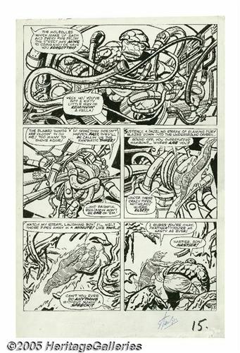 <B>Jack Kirby and Dick Ayers - Fantastic Four #20, page 13 Original Art (Marvel, 1964).</B></I> In an underground cavern, Bashful Ben Grimm is brought to his rocky knees by an attack of "molecularly-controlled" pipes. Suddenly, a dazzling streak of flaming fury blazes down to melt the menace -- it's the Human Torch! This page features the Thing and Johnny Storm battling one of their arch-rivals, the all-powerful Molecule Man! There's even time for a quiet moment between friends in the final panel (although you have to read between the lines)! A scorching bit of Silver Age Marvel with an image area of 12.5" x 18.5", and in Excellent condition. Signed by Stan Lee in the lower right-hand corner.