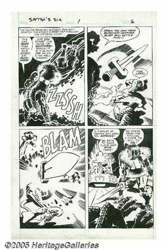 <B>Jack Kirby and Frank Miller - Satan's Six #1, page 6 Original Art (Topps, 1993).</B></I> Two of the greatest storytellers in the entire history of American comics teamed to create but <I>one</B></I> page for <B>Satan's Six</B></I> #1, and this is it! Frank Miller inked Jack Kirby's pencils on page six of the yarn and the master of modern comics added his distinctive chiaroscuro inking technique atop the "King's" pulse-pounding pencils for an action scene that can't be beat! The page has an image area of 10" x 15" and the art is in Excellent condition.
