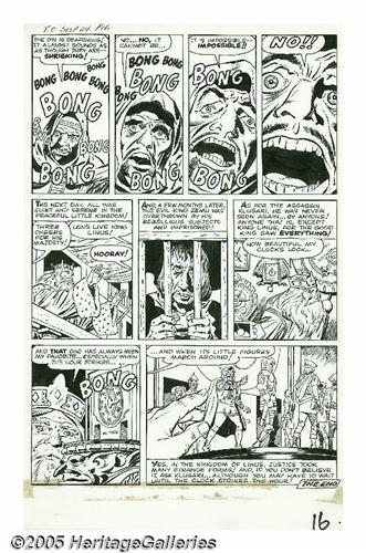 <B>Jack Kirby and George Klein - Tales of Suspense #24, page 6 Original Art (Marvel, 1961).</B></I> "Ask not for whom the bell tolls, it tolls for thee!" King Linus' would-be assassin, Klugari, finds himself reduced to an ornamental figure on a chiming clock in this supernatural scene from <B>Tales of Suspense</B></I>.George Klein's inks add a delightful Silver Age finish to Jack Kirby's peerless penciling. The image area of the art measures 12.5" x 18.5" and, other than a glue residue stain at the bottom of the page, the art is in Excellent condition.