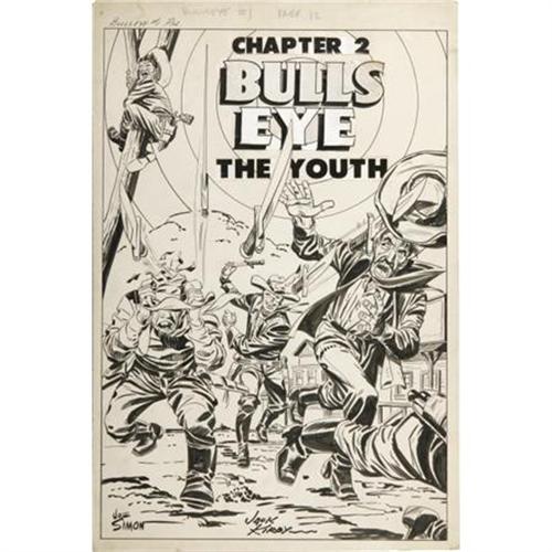 <B>Jack Kirby and Joe Simon - Bulls-Eye #1, Splash Page 12 Original Art (Mainline, 1954).</B></I> This Simon and Kirby spectacular is a Silver Age sensation. It showcases Kirby's trademarked use of extreme foreshortening and the readers' eyes are led right to the action, with a powerful image of Bulls-Eye himself at center stage. These two comic book creators were both masters in their own rights, but putting them together sparked an industry revolution. This thriller has an image area that measures 12" x 18". The logo stat shows some light staining; otherwise, the art is in Excellent condition. Both artists have signed the page along its lower border. <I> From the Fantastic Frank Collection.</B></I><BR><BR><b>Shipping:</b> Flat Material, Small (<a target="_blank" href="http://www.heritageauctions.com/common/shipping.php">view shipping information</a>)