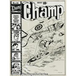 Jack Kirby and Joe Simon - Original Cover Art for Champ Comics #21 (Harvey, 1942). This is a terrific WWII propaganda cover, with an American Liberty Lad bailing out of a British plane, ready to take on the Nazi warship below, with nothing but a tommy-gun! The title-logo and filmstrip framing elements are replacements. The art measures 14.5" x 20", with an image area of 10.5" x 14.5". The condition of the art is very good. There are small touches of white-out, and some wear, to the lower right corner of the art paper, well outside the art area. Important notice: Heritage usually auctions material at the rate of 200-250 lots per hour. On some occasions eBay Live bid software or the Internet may not be able to keep up with the pace of the auction. We recommend placing a realistic absentee bid now as insurance to avoid disappointment. Occasionally the auctioneer may eliminate or reject an eBay Live bid, and the auctioneer may also reopen a lot after the close of the eBay live bidding (usually because we missed an audience bid), and may reject your bid even if it shows you as the winning bidder. By bidding via eBay Live, you agree that Heritage may award the lot to another bidder at its sole discretion under the circumstances described above or any other reasonable circumstances. Since eBay bids are not shown to us until we open the lot on the floor, we treat those bids just like floor bids. In most cases the floor responds before the eBay bid is presented to us, due to Internet lag time, so for consistency we have made it a policy that floor bids are always considered first over tie eBay live bids. Also please note that all Heritage lots purchased through eBay Live carry a 20% Buyer's Premium. Please make sure you read the Terms and Conditions before you bid.