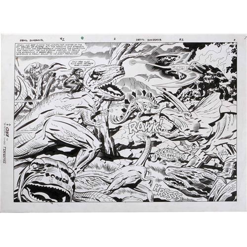 <B>Jack Kirby and Mike Royer - Devil Dinosaur #1, Splash Page 2 and 3 Original Art (Marvel, 1978).</B></I> Moonboy urges Devil Dinosaur into the fray in this killer-diller Jack "King" Kirby double-page splash. The prehistoric thrill-o-rama has an image area of 21" x 15", and the art is in Excellent condition. This spectacular scene was drawn on one large sheet of paper, rather than two separate pages. As the Great One himself would say, "Just bid on it!"